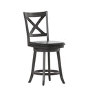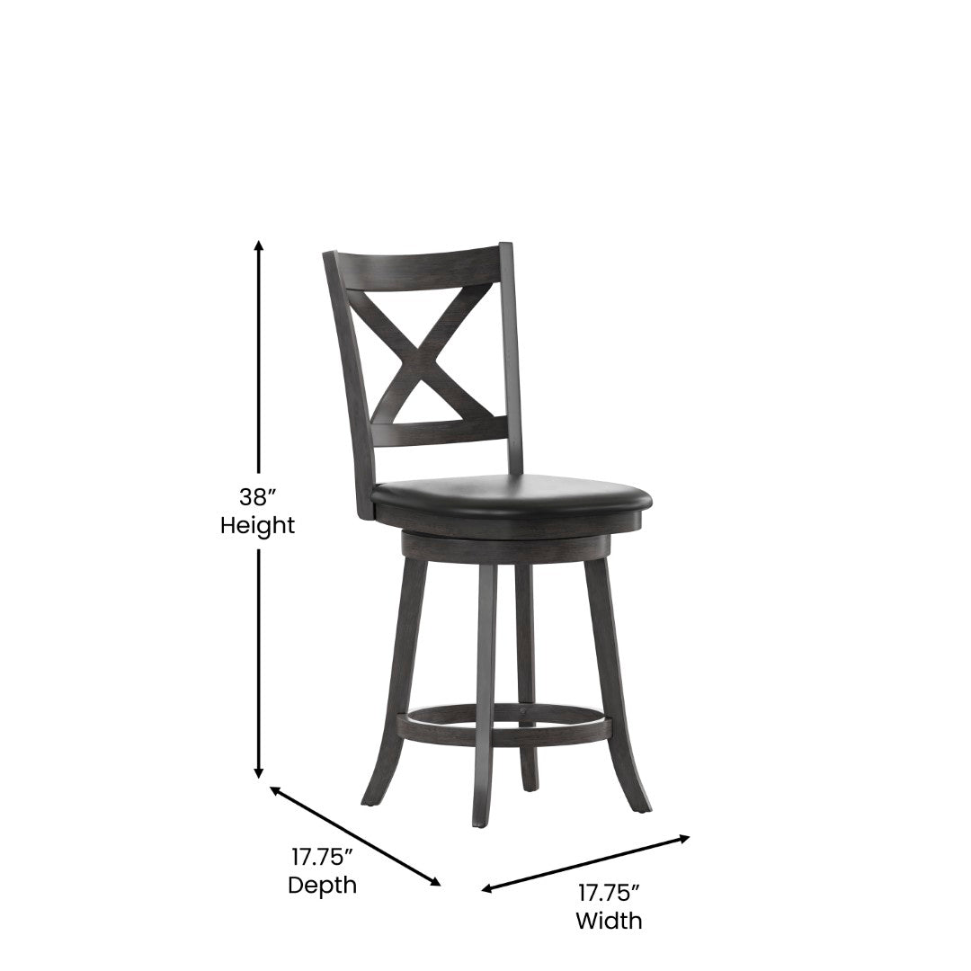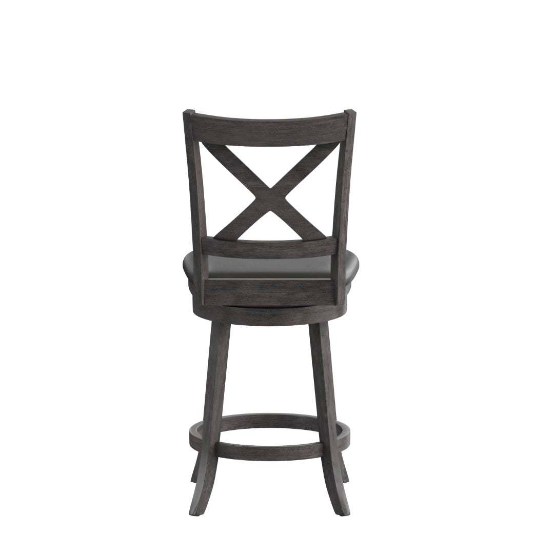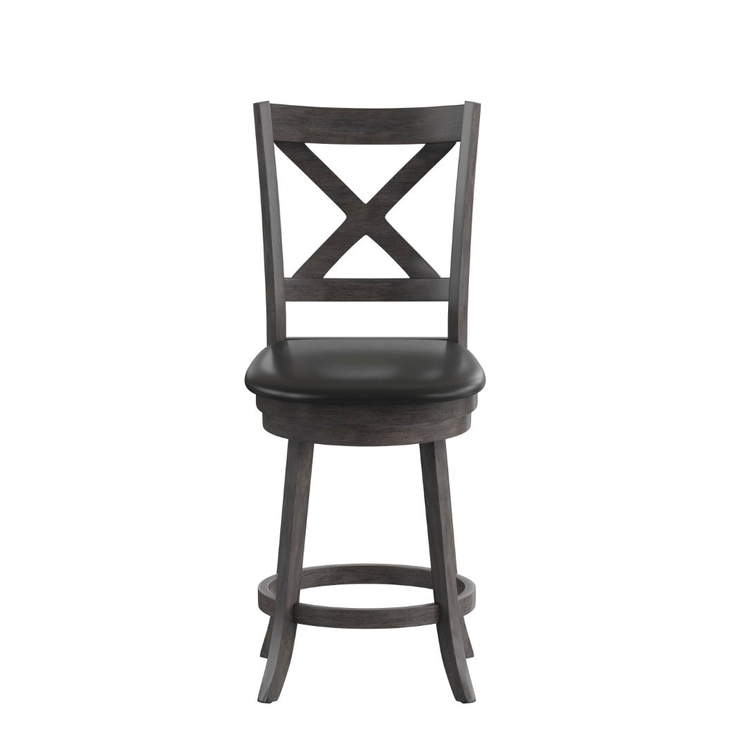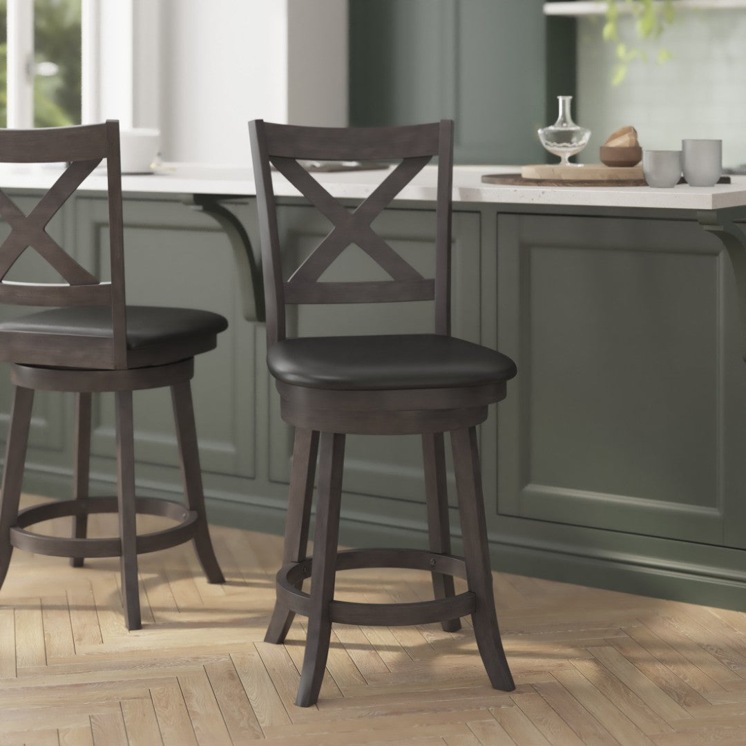 Add timeless charm and reliable commercial performance to your dining or bar area with this classic crossback swivel counter stool. Combining a gray wash walnut solid wood frame with a plush Black LeatherSoft seat, this stool is designed for comfort, durability, and effortless conversation—ideal for busy homes, restaurants, or cafés that need a polished, long-lasting seating solution.