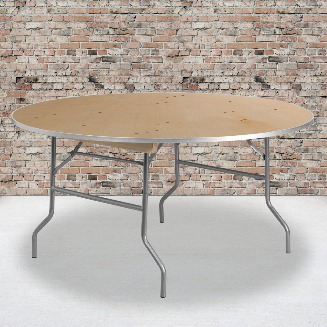 Built for heavy use and elegant enough for formal events, this 5-foot round folding banquet table combines commercial-grade construction with a refined birchwood surface. Its robust materials and thoughtful engineering make it ideal for party rental companies, event venues, churches, schools, and any setting that requires reliable, stackable, and easy-to-store seating for up to eight adults.