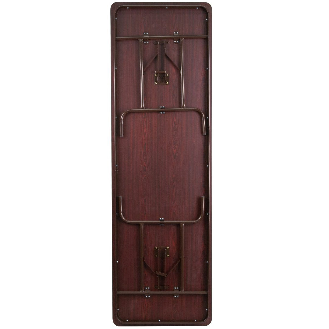 A durable, commercial-grade folding banquet table designed for events, cafeterias, schools, and hospitality settings where reliable performance and easy storage are essential. The mahogany high-pressure laminate top delivers a warm, professional appearance while the sturdy pedestal legs and protective caps provide long-lasting stability and floor protection. Ideal for temporary seating or everyday use, this table balances strength, portability, and attractive finish.