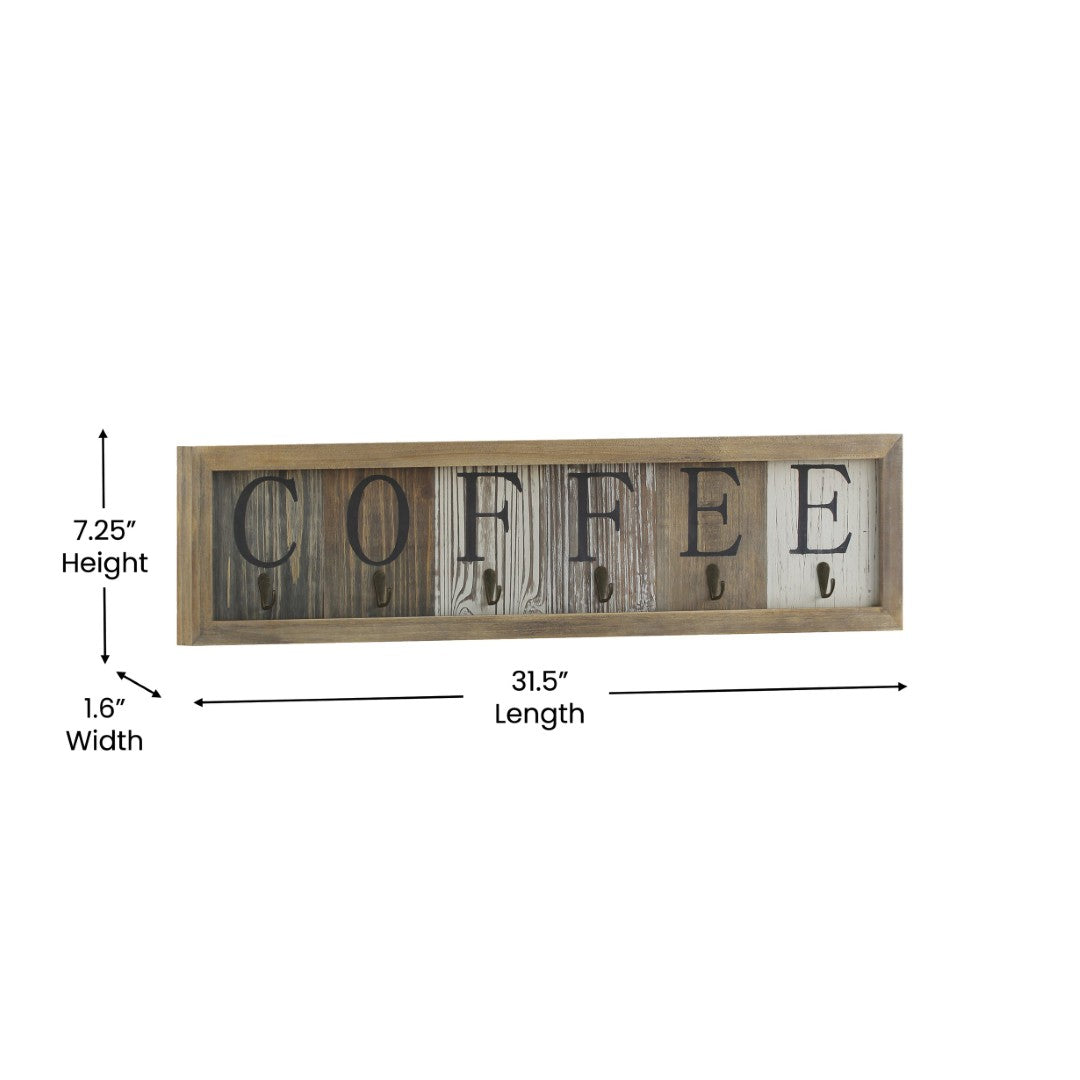 Keep your kitchen, coffee bar, or dining nook neat and stylish with this rustic wall-mounted mug organizer. Its distressed wood-grain finish and printed lettering bring farmhouse charm, while sturdy pine construction and six metal hooks provide reliable everyday storage for your favorite coffee and tea cups — ready to hang right out of the box with included hardware.