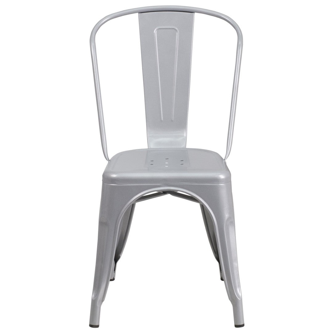Bring modern durability and timeless style to your indoor or outdoor seating area with this commercial-grade 5-piece metal dining set. Designed for versatility and high-traffic use, the set pairs a glossy black square table with four stackable chairs that are equally suited to patios, cafes, bistros, and home dining rooms. The powder-coated iron finish resists weather and wear while thoughtful details—like drain holes and rubber glides—make the set both practical and low-maintenance.