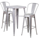 - Set includes: One square bar-height table and two full-back bar stools—ready to place in dining, patio, or compact multi-use spaces.