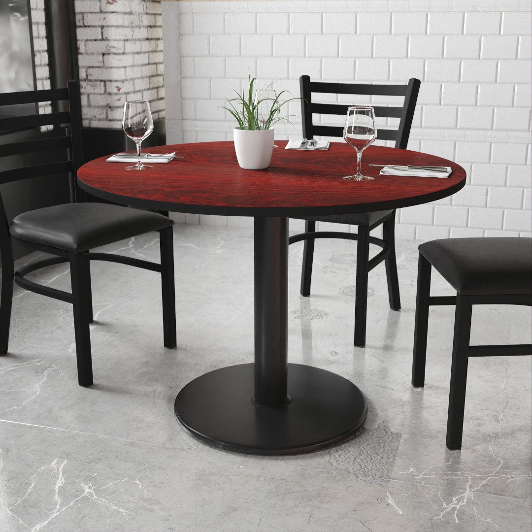 Add warmth and professional style to your restaurant, break room, cafeteria, or home with this durable mahogany laminate table set. Designed for commercial hospitality use, it delivers a reversible finish, resilient surface protection, and a sturdy cast-iron base for long-lasting performance and easy maintenance.