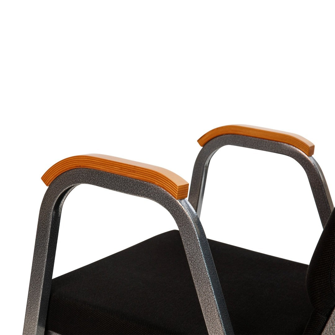 Refresh your seating with a versatile, commercial-grade stacking armchair designed for worship centers, event venues, lecture halls, and corporate spaces. This upholstered chair combines durable construction, comfortable ergonomics, and attractive finishes—black fabric upholstery with a silver-vein steel frame and wood-accent arms—for a refined look that performs where it matters most.