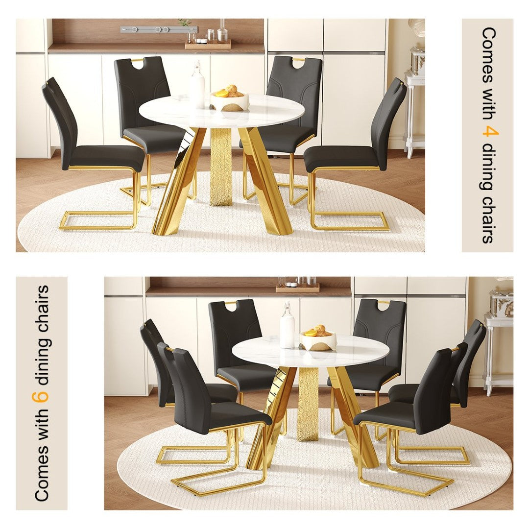 Bring modern luxury to your dining space with this elegant 5-piece set: a 42-inch round dining table with a Snow Mountain White textured sintered stone top and three stainless steel legs, paired with four uniquely styled black dining chairs featuring gold metal legs. The refined materials and streamlined silhouettes create a cohesive look that suits contemporary apartments, villas, and upscale commercial settings while delivering durable, easy-care performance for everyday use.