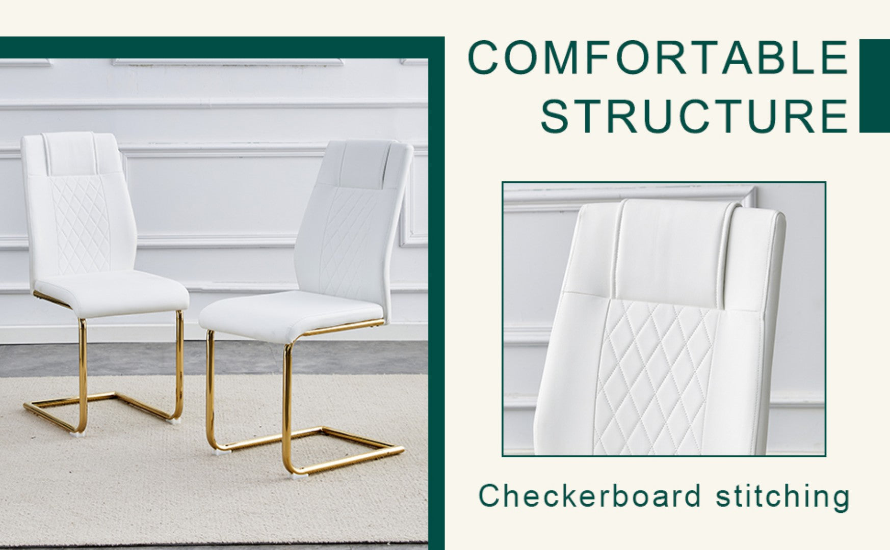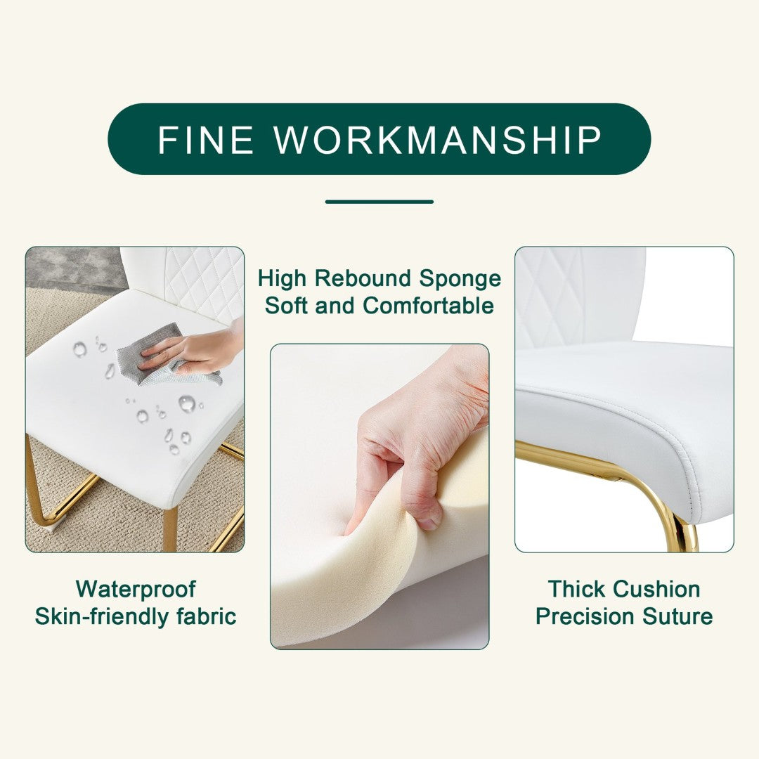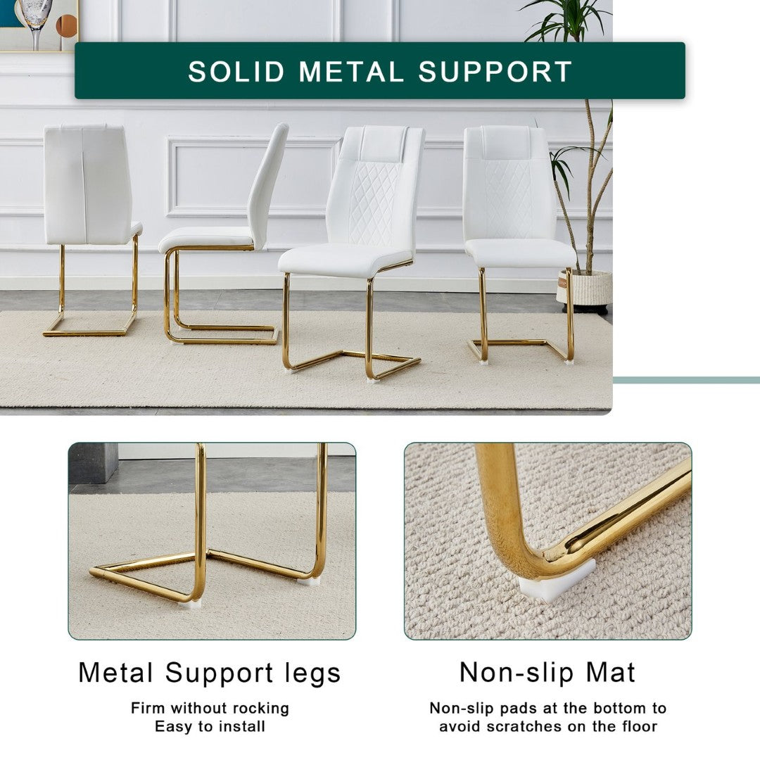 - Chairs (x4): High-quality white PU upholstery with a grid-patterned backrest, sponge-filled for comfortable support; arched gold metal legs for a cohesive look and strong stability.
