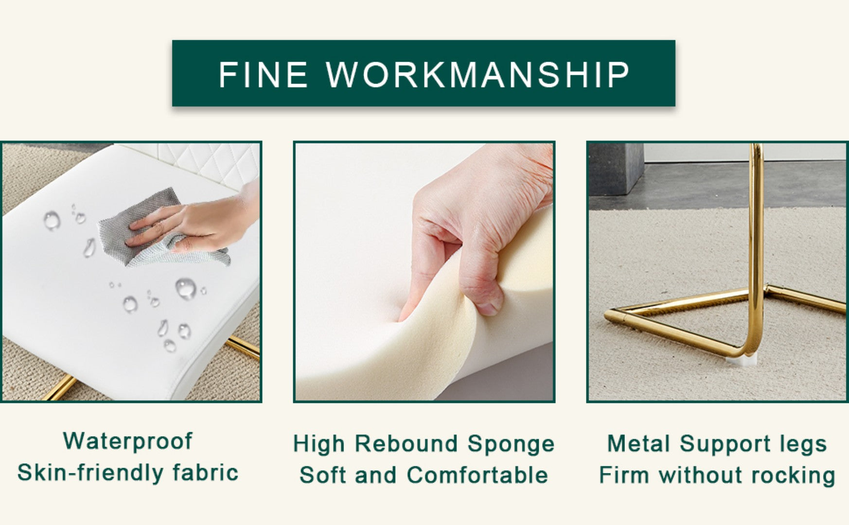 - Stable Arched Metal Legs: The gold arched metal legs not only add a sense of design but also provide strong support, ensuring the stability and durability of the chair.Keeping the secure of the seat during use.Anti-Slip Protective Feet: The anti-slip feet design at the bottom of the chair legs protects the floor from scratches and increases the safety of the chair during use.
