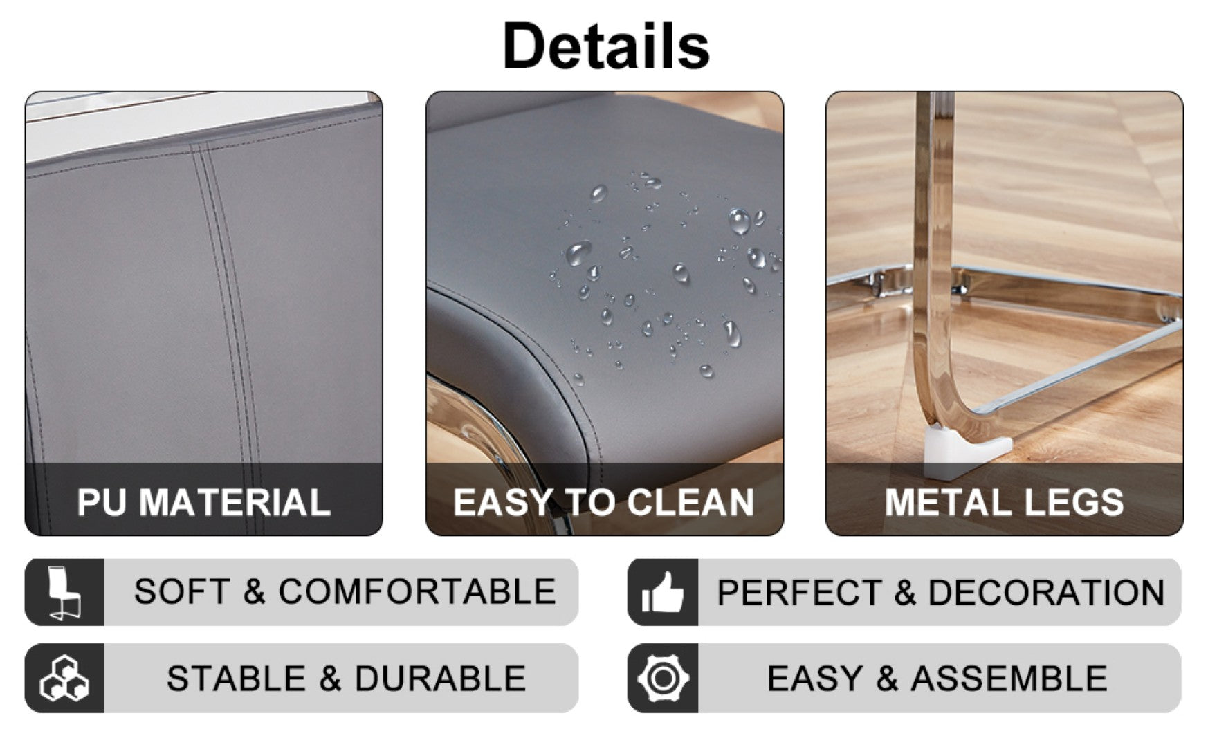 - Stable Arched Metal Legs: The silver arched metal legs not only add a sense of design but also provide strong support, ensuring the stability and durability of the chair.Keeping the secure of the seat during use.Anti-Slip Protective Feet: The anti-slip feet design at the bottom of the chair legs protects the floor from scratches and increases the safety of the chair during use.