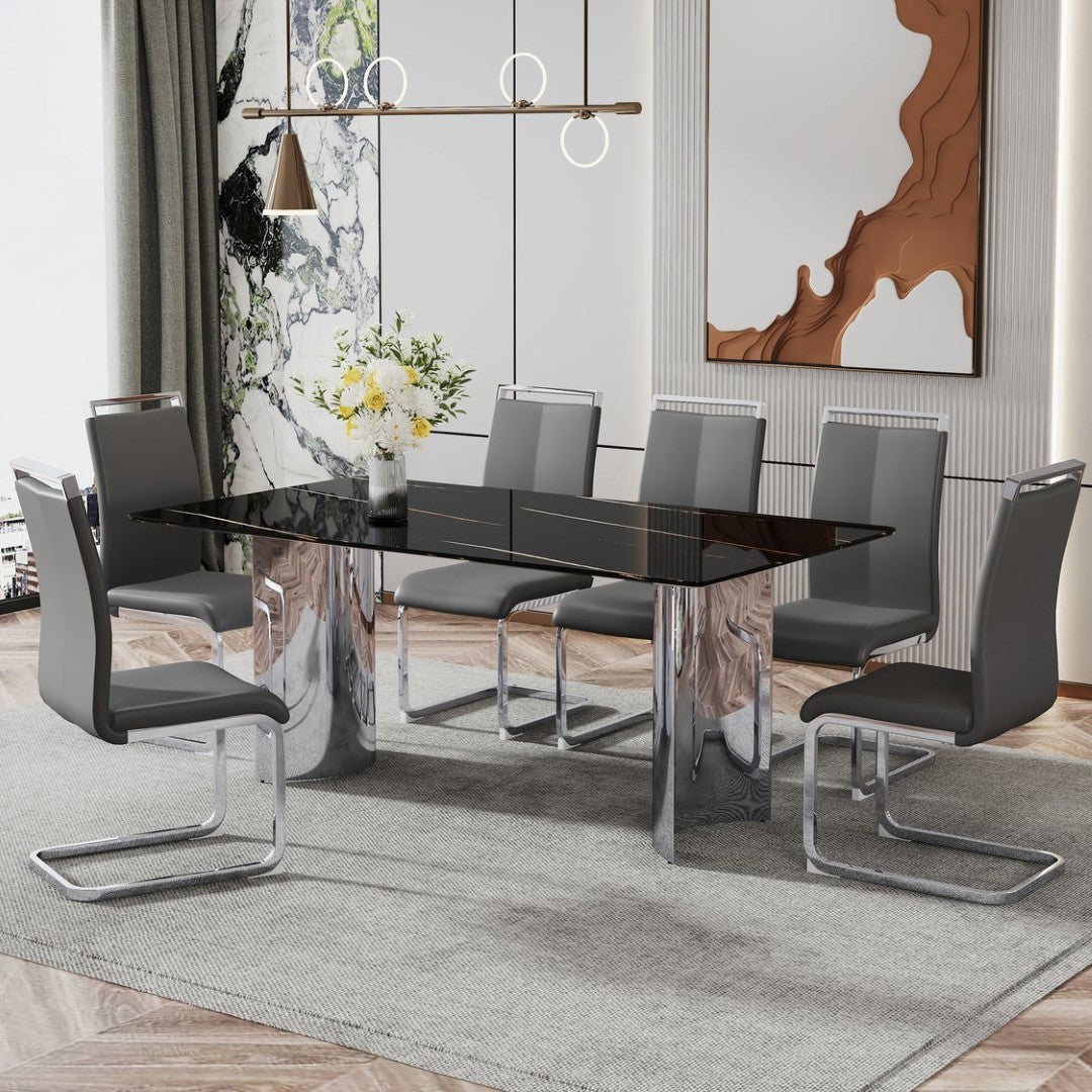 Elevate your dining and entertaining space with this modern table and 6-chair set that blends sleek materials and practical design. The tempered glass tabletop features a sophisticated black marble-pattern sticker for a luxurious look, while stainless steel and silver metal accents provide contemporary shine and durable support. Comfortable dark gray PU chairs with arched C-tube legs complete the set, offering everyday comfort and easy maintenance for family meals, gatherings, or presentation use.