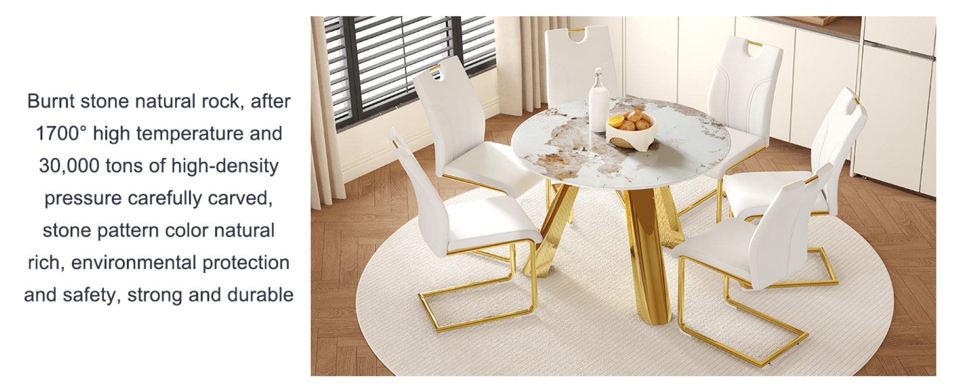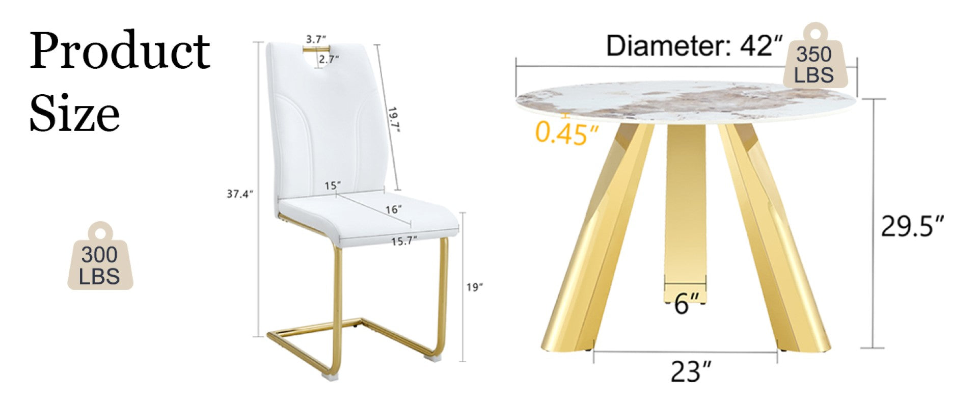 Bring modern luxury to your dining space with this striking 7-piece set: a 42‑inch white imitation marble round table paired with six sculptural white dining chairs finished with gold metal legs. Thoughtfully designed for both everyday meals and special gatherings, the set combines durable, premium materials with clean lines and a refined metallic accent that elevates any decor from contemporary apartments to upscale restaurants.