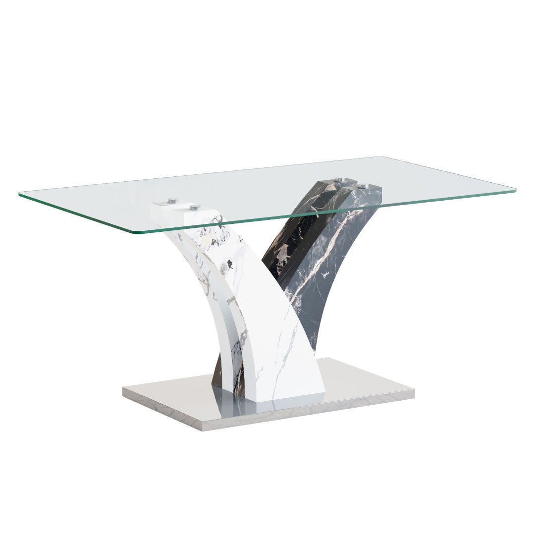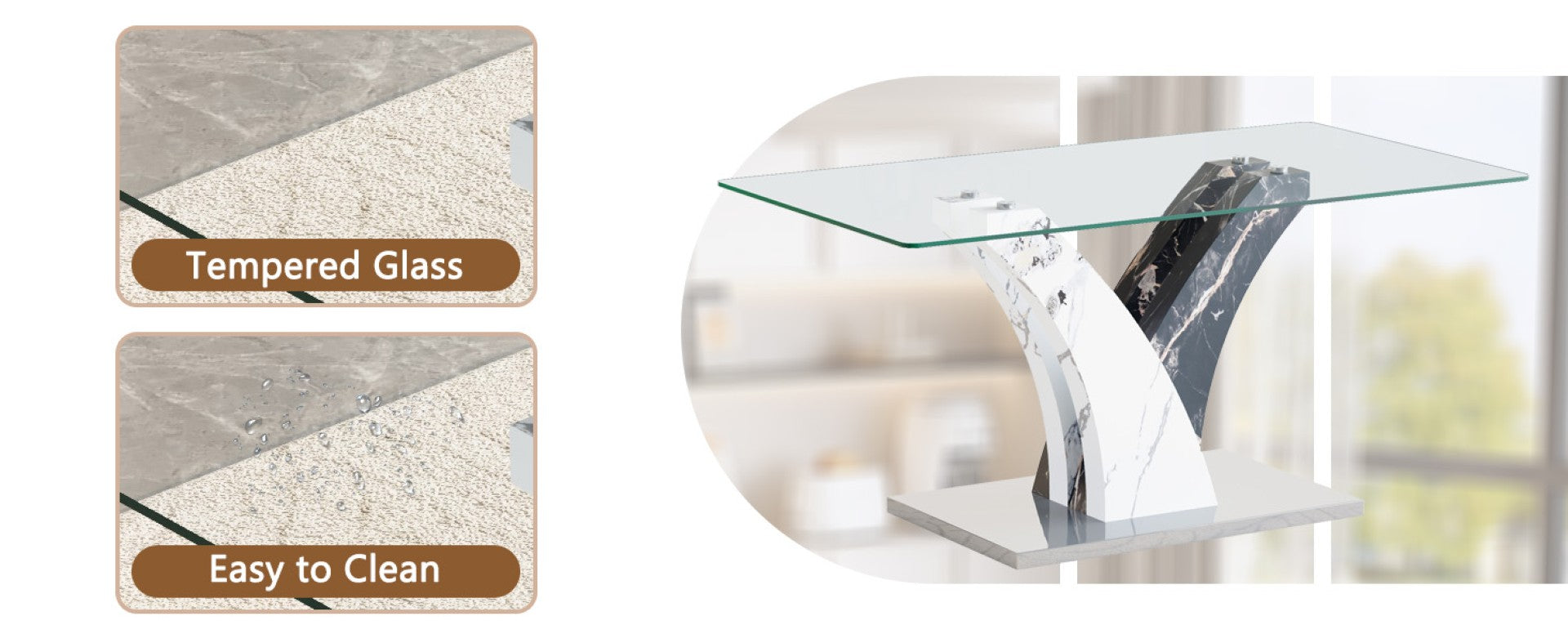 - MDF material is sturdy and durable, not easily deformed, while tempered glass tabletops have high strength and wear resistance. The shape of the table legs not only provide stable support, but also add unique design elements to the table. Combined with tempered glass tabletop to ensure stability during use.