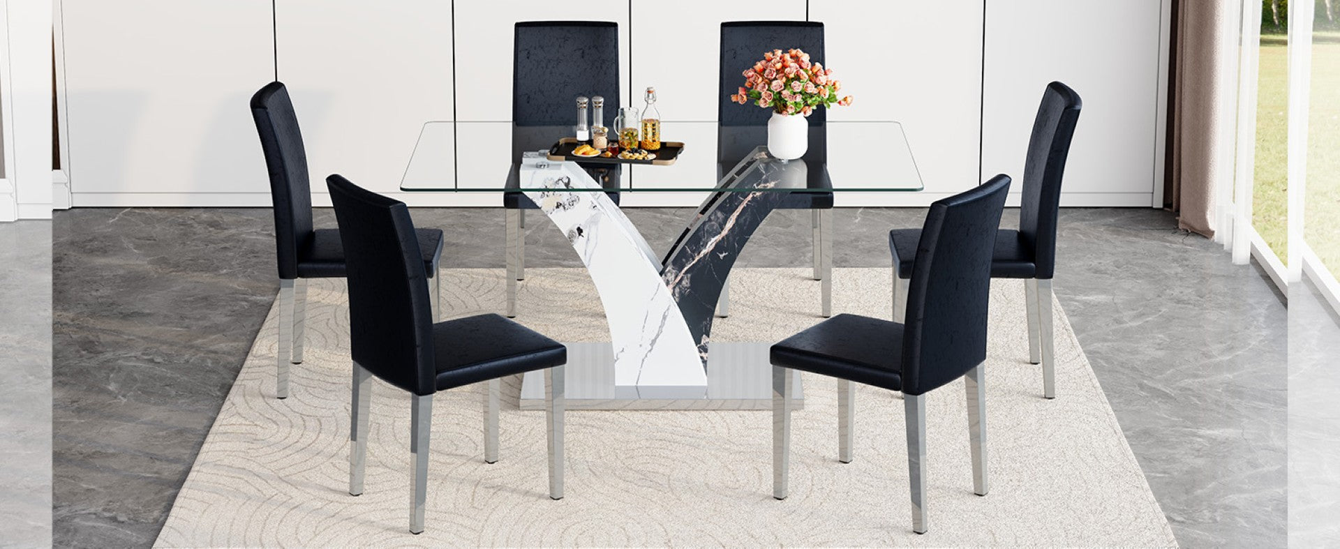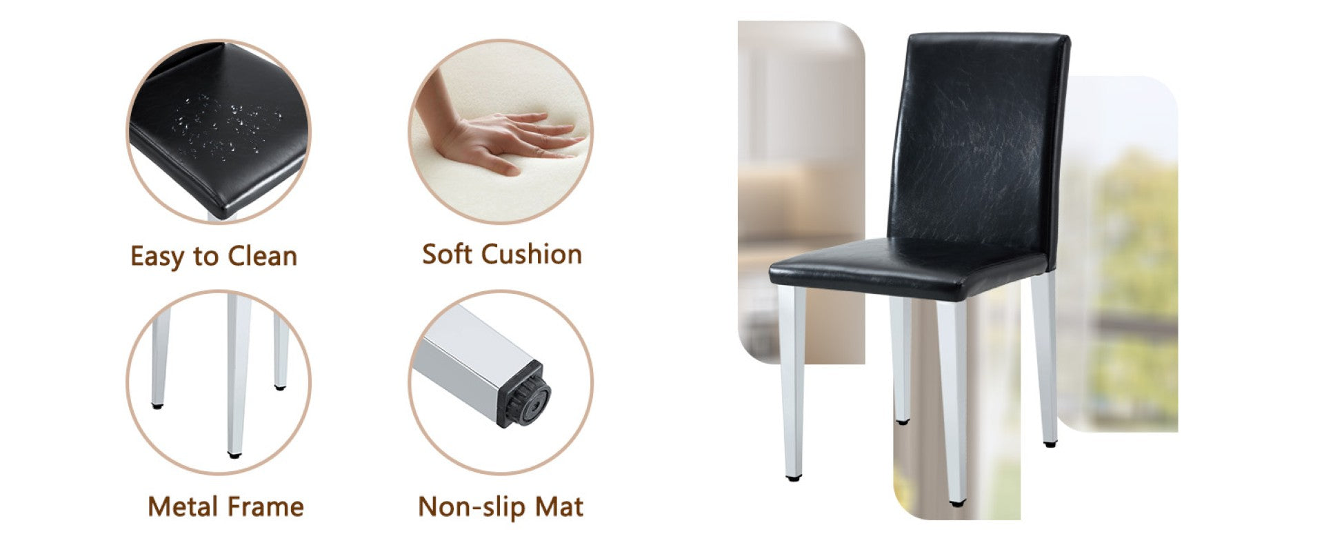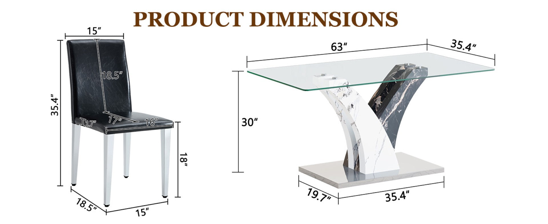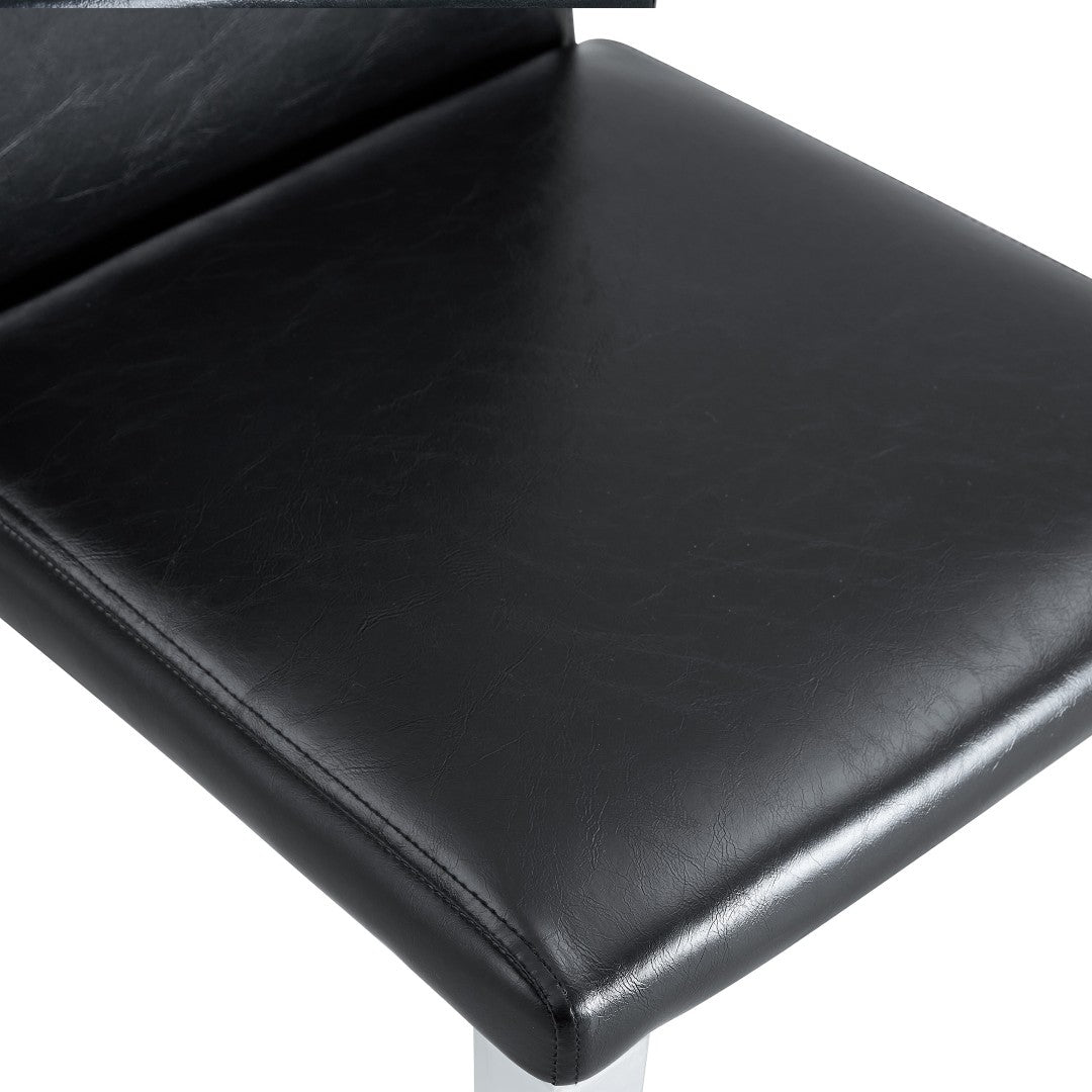 - Materials: Tempered clear glass tabletop, MDF legs, PU leather upholstery, high-elasticity sponge seat filling, and silver-finished metal chair legs.