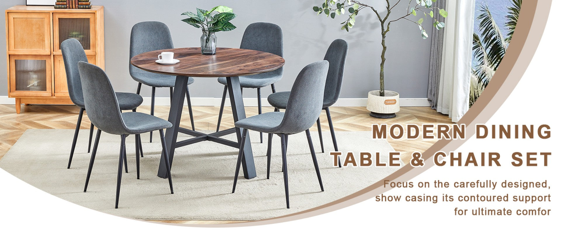 Bring modern minimalist style to your dining area with this elegant 7-piece set: a 42-inch round table paired with six dark gray linen chairs. Designed for everyday use and crafted for lasting comfort, the set combines a warm walnut tabletop with sturdy black metal supports and breathable linen-cotton upholstery to create a cohesive look that fits kitchens, dining rooms, and multi-use spaces.