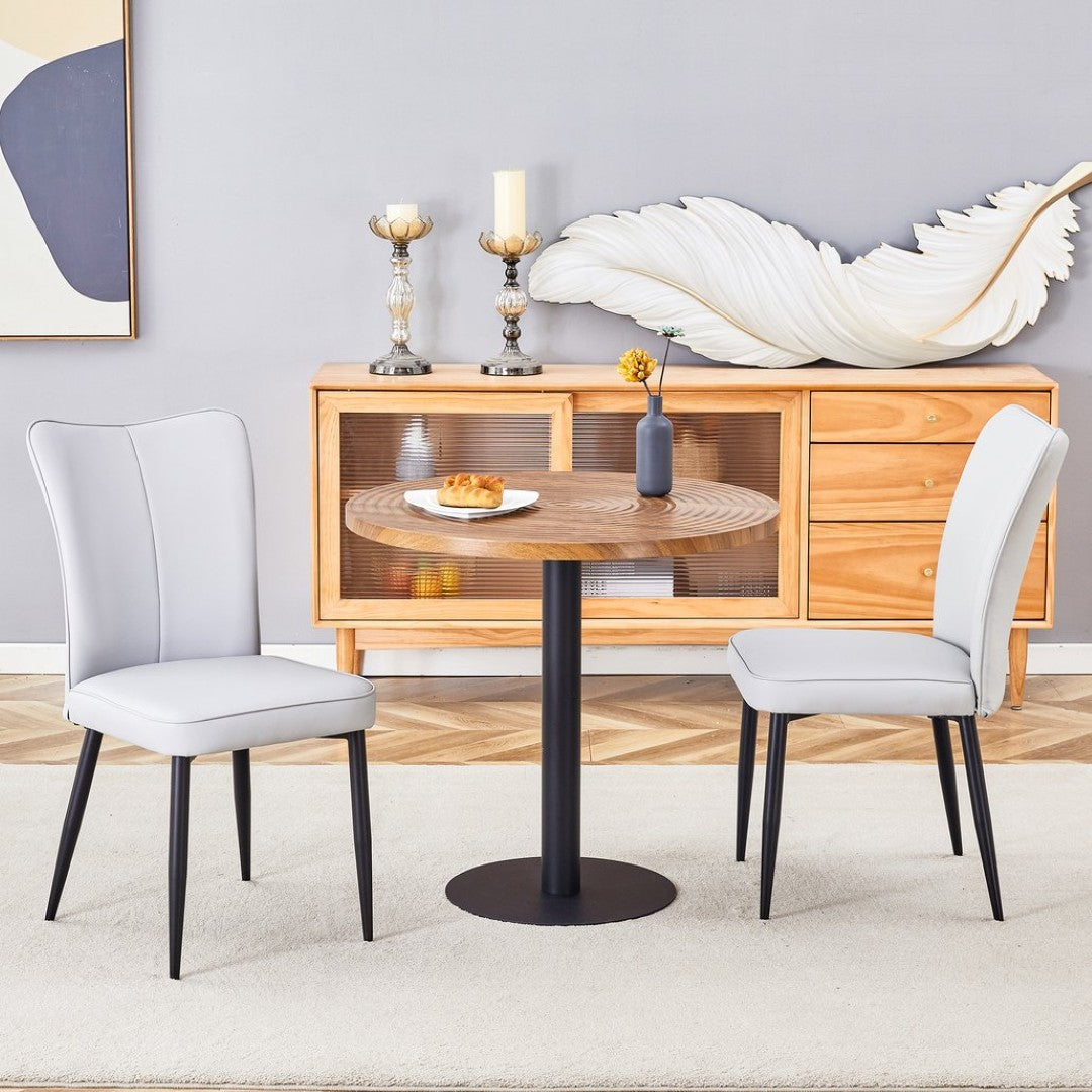 Enjoy a stylish, space-saving dining solution that blends modern industrial design with everyday comfort. This compact round table and two-chair set pairs a dark wood-grain MDF tabletop with a sturdy black metal base and two light-gray PU-upholstered chairs, creating a cohesive look that suits kitchens, dining nooks, small apartments or multifunctional workspaces.