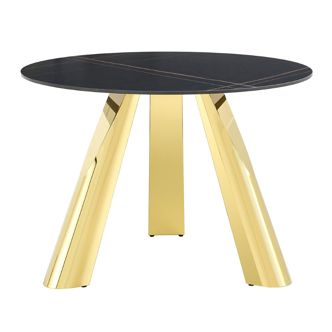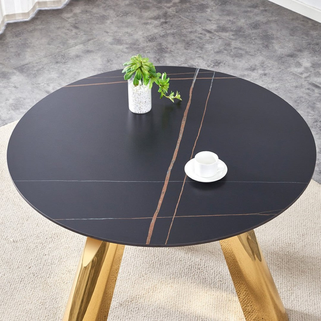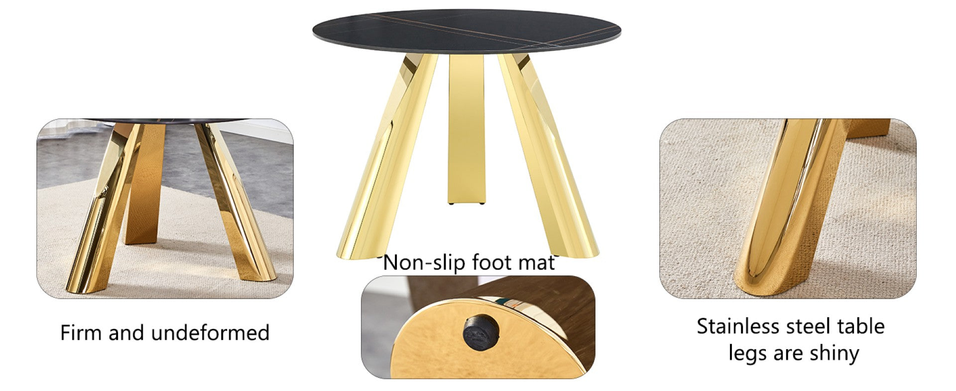 - Table Frame & Legs: Golden stainless steel legs (three substantial circular supports) provide excellent stability and a modern, luxurious visual accent.