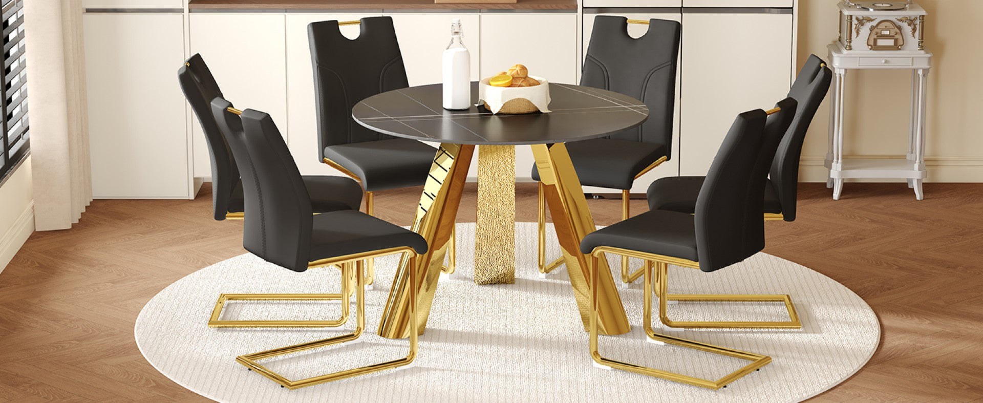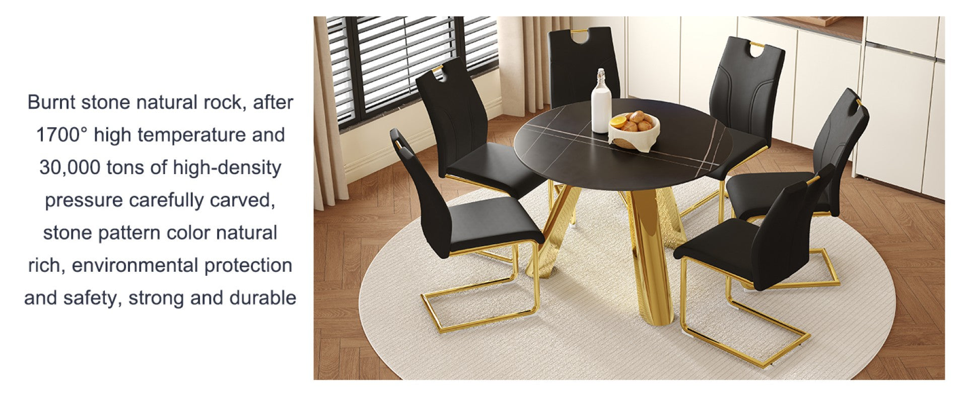 Introduce a touch of contemporary luxury to your dining space with this striking round table and six-chair set. Combining a high-performance sintered stone tabletop with gold-finished stainless steel legs and six ergonomically styled black chairs, this ensemble delivers durability, comfort, and a refined aesthetic ideal for modern homes, apartments, or hospitality settings.