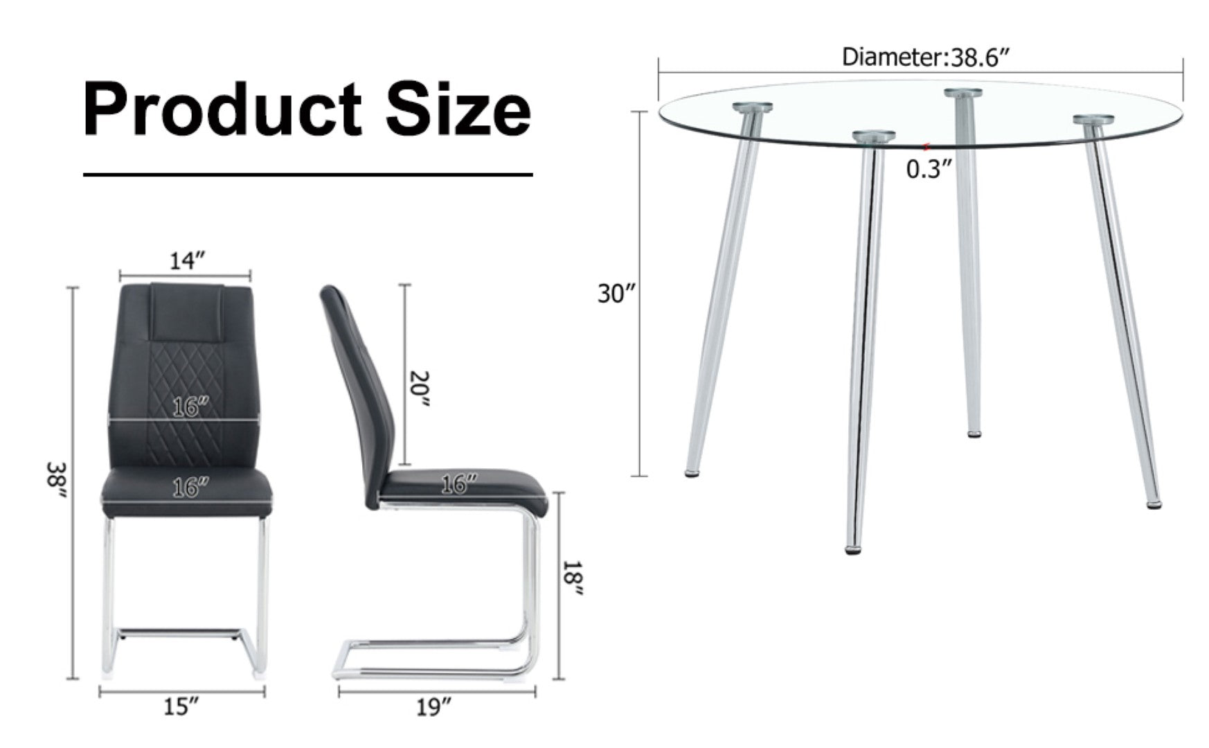 - Materials: 38.6" transparent tempered glass tabletop, silver-plated metal legs for table and chairs, and high-quality black PU leather upholstery on chairs.