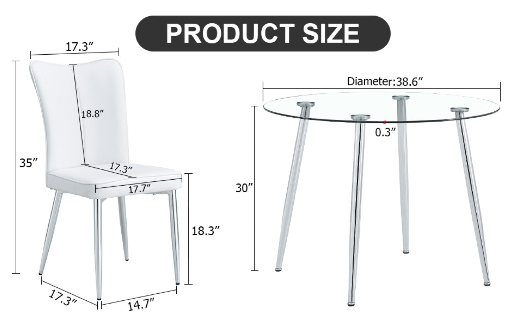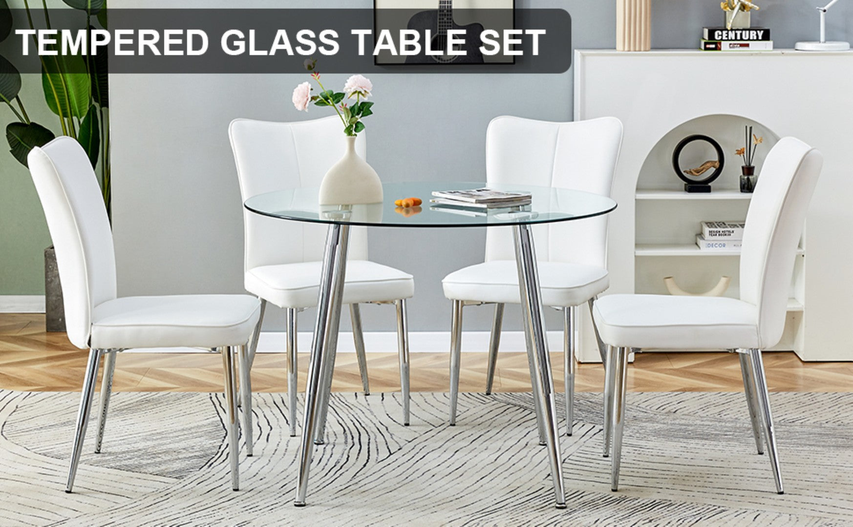 Enjoy contemporary dining with this sleek table and chair set that blends transparent tempered glass and clean white upholstery for a light, modern look. Ideal for small dining rooms, kitchens, or bistro-style spaces, the set pairs a round glass table with four comfortable white PU chairs featuring a subtle vertical stripe backrest — delivering both style and everyday functionality.