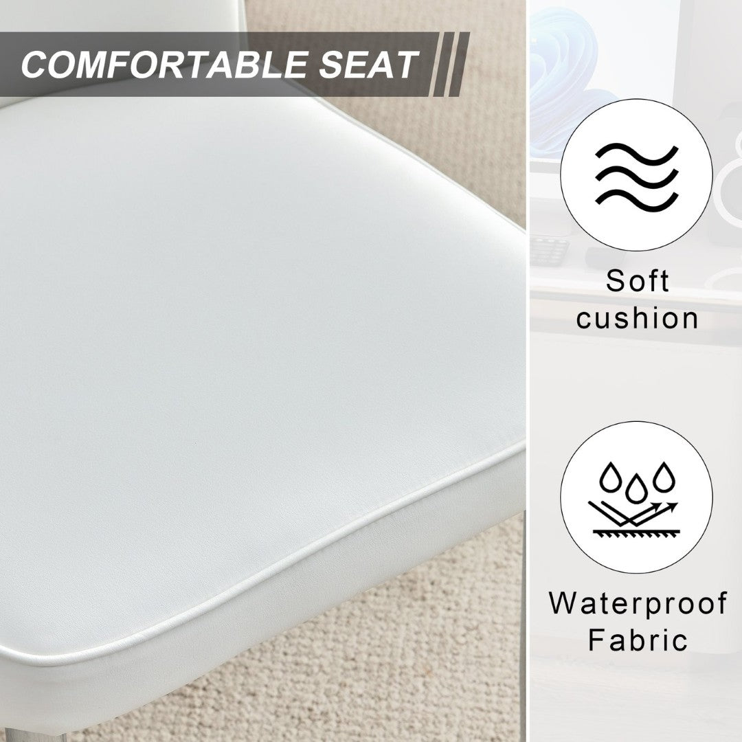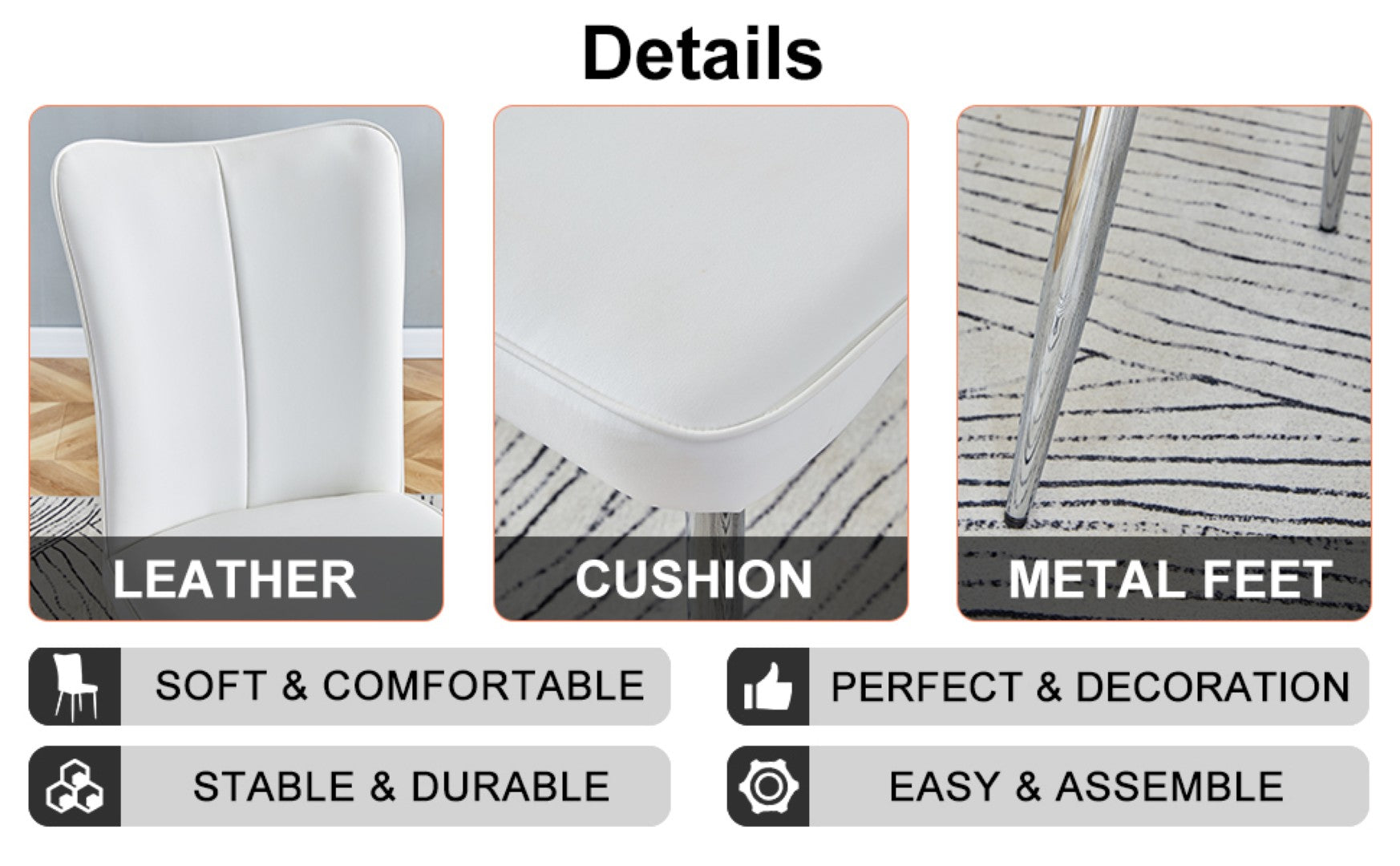 - Silver Metal Leg Support: The silver metal legs at the bottom of the chairs echo the metal legs of the table, adding a touch of subtle luxury.Reassuring Anti-Slip Design: The silver metal leg of the chair is equipped with anti-slip feet at the bottom that protect your floor like guardians, ensuring the stability of the dining chair.