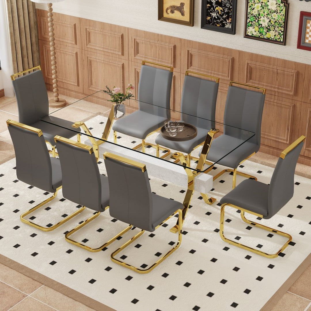 Elevate your dining space with this modern, minimalist dining set that blends transparent tempered glass, rich dark gray upholstery, and warm golden metal accents. The large clear glass tabletop creates an open, airy feel while the comfortable PU chairs provide supportive seating for family meals and entertaining. Thoughtful construction details — from anti-slip feet to sturdy metal leg designs — ensure durability and quiet everyday use.