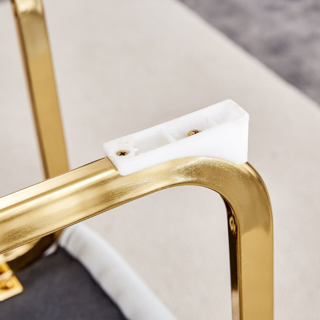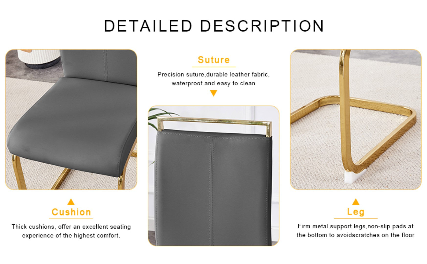 - Stable Arched Metal Legs: The golden arched metal legs not only add a sense of design but also provide strong support, ensuring the stability and durability of the chair.Keeping the secure of the seat during use.Anti-Slip Protective Feet: The anti-slip feet design at the bottom of the chair legs protects the floor from scratches and increases the safety of the chair during use.