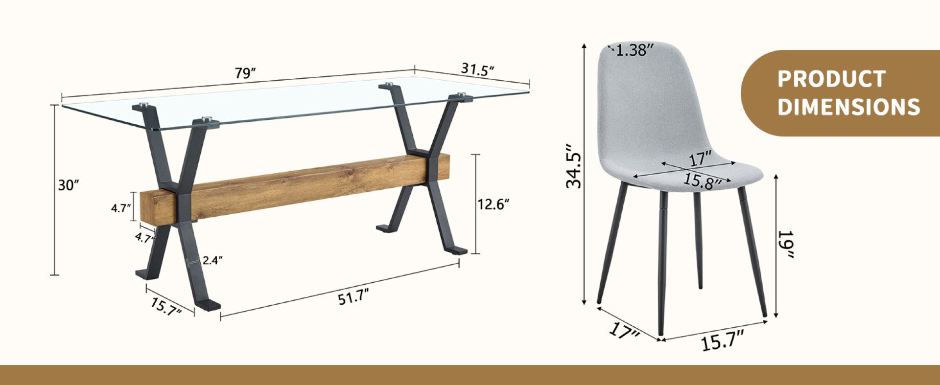 Elevate your dining space with this contemporary table and 6‑chair set that blends modern materials and clean lines for both style and daily functionality. The transparent tempered glass top highlights the table’s airy, minimalist aesthetic while the X-shaped metal legs and wood‑grain MDF crossbeam deliver sturdy support. Paired light‑gray linen chairs offer breathable comfort and an elegant contrast to the black metal finishes.