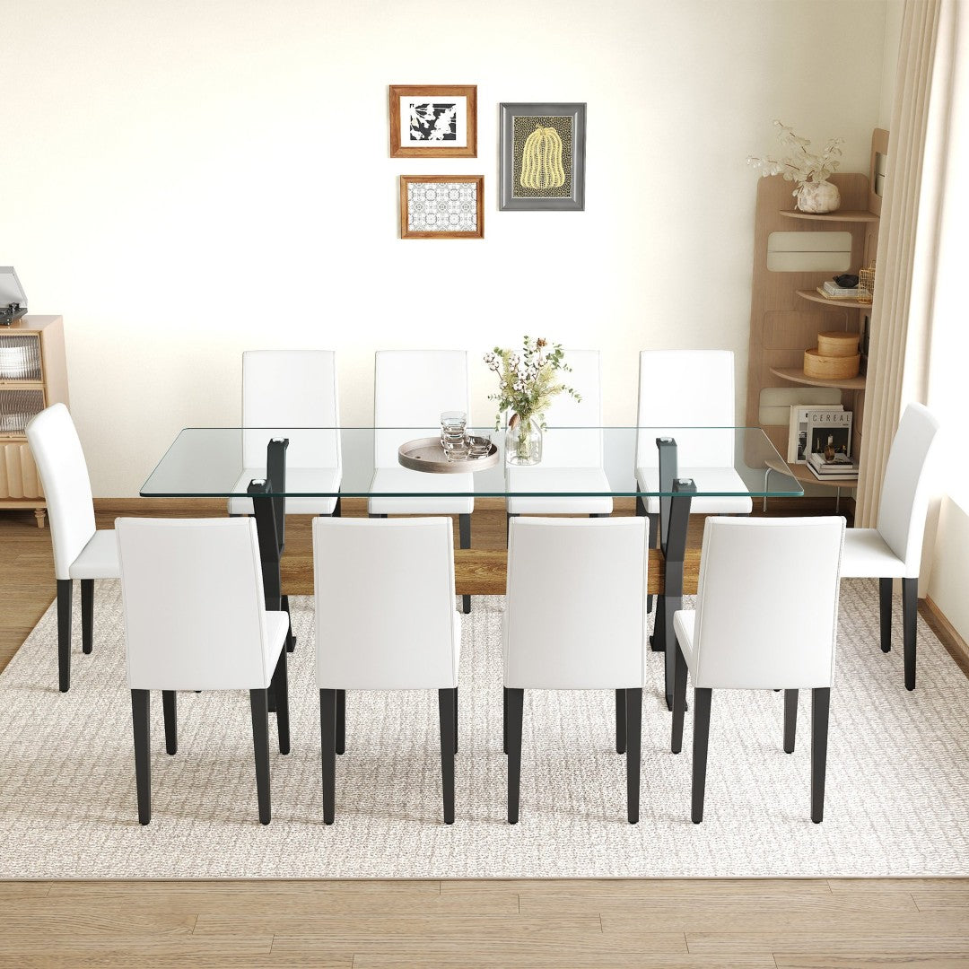 Create a modern, airy dining experience with this versatile table and chair set—designed for family meals and entertaining. The large transparent tempered glass tabletop, bold X-shaped metal legs, and a full complement of comfortable PU chairs combine durability with streamlined aesthetics to suit contemporary and transitional interiors.