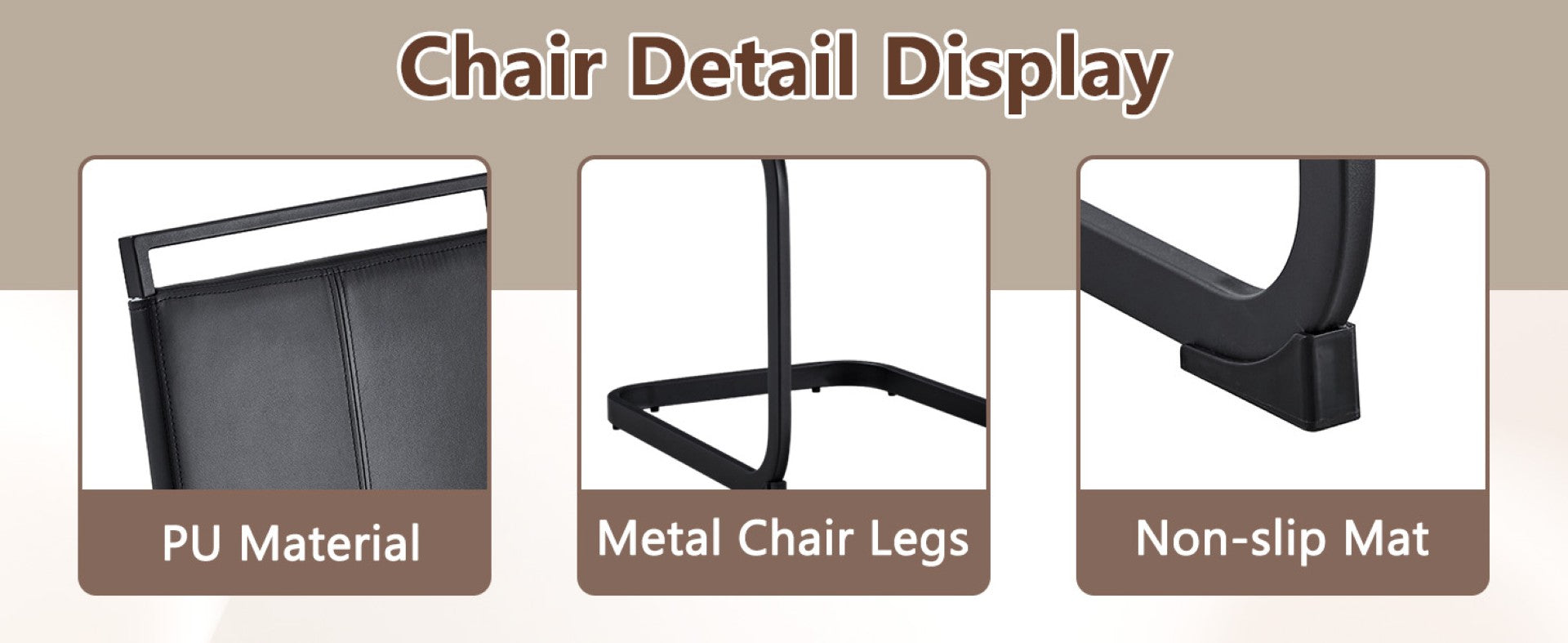 - Materials: Realistic wood-texture MDF tabletop with durable sticker finish, transparent gray glass inset, breathable PU leather upholstery, and sturdy metal chair legs.