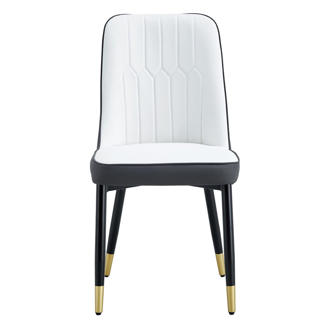 - The accompanying chairs are designed in white and dark gray spliced color, with black metal chair legs,simple yet luxurious.The chairs are filled with sponge for a soft and comfortable sitting experience.The chairs are designed according to ergonomics, providing a more comfortable sitting posture, with simple line designs on the backrest.