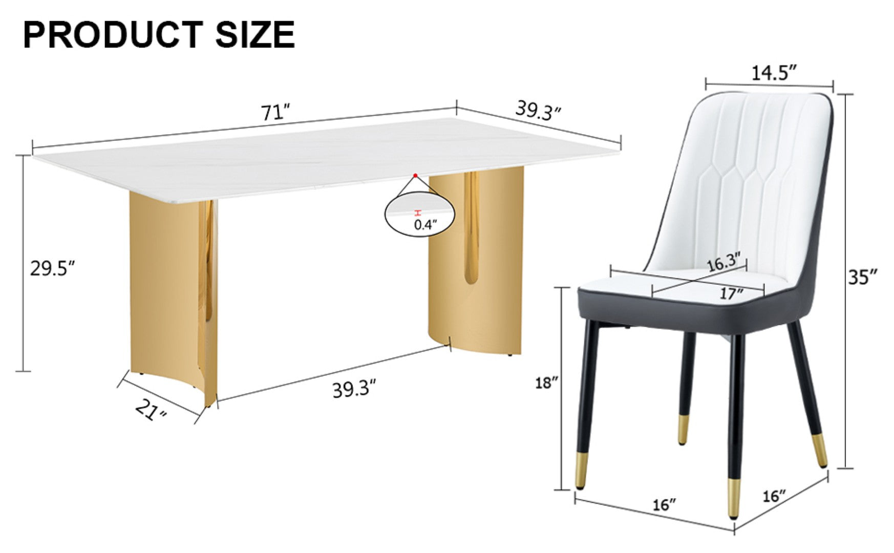 - Gold Leg Decoration: Black metal chair legs with gold spray decoration at the bottom, echoing the table legs' gold decoration, adding a touch of luxury to the design.Anti-Slip Feet: Anti-slip feet are designed to protect the floor and ensure the stability of the dining table and chair during use.