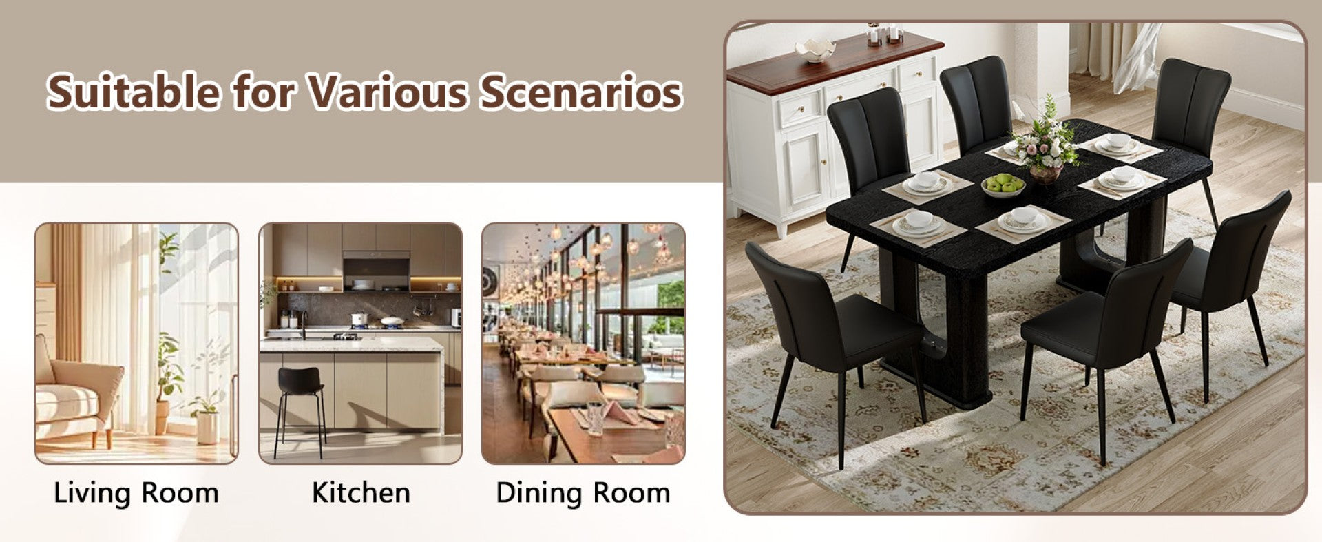 - Complete set: one textured black dining table plus six matching black PU chairs with black metal legs