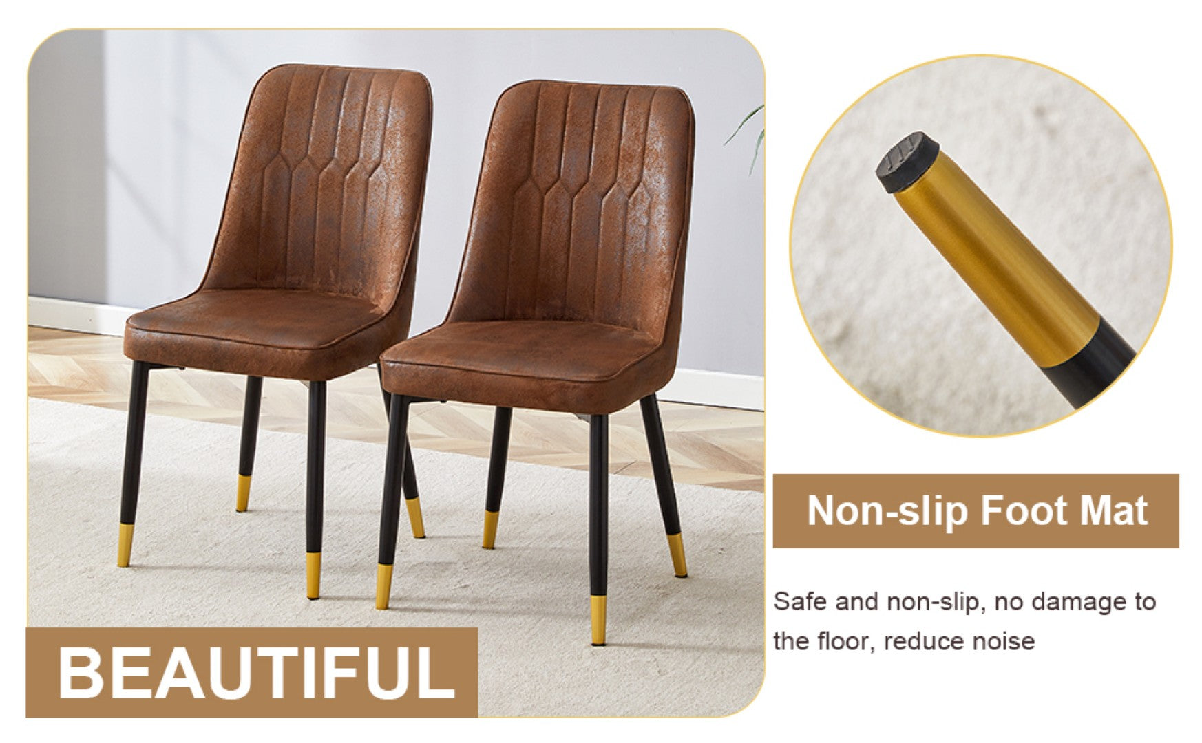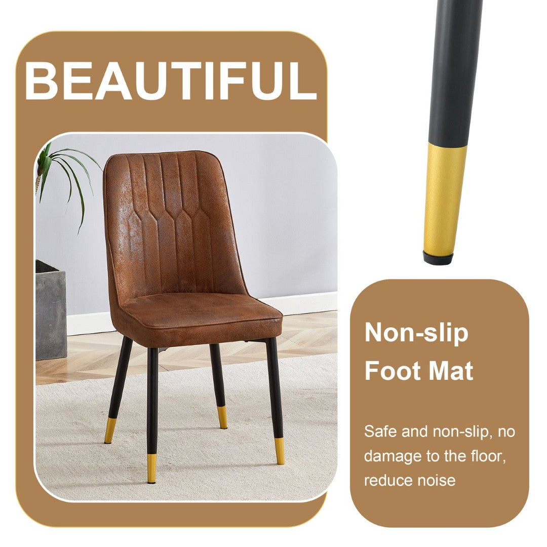 - Brown Suede Dining Chairs: Four armless chairs are made of brown suede fabric, offering a soft and comfortable texture.Black Metal Chair Legs: The chairs feature black metal support legs with gold spray decorations at the lower ends, adding a touch of luxury.