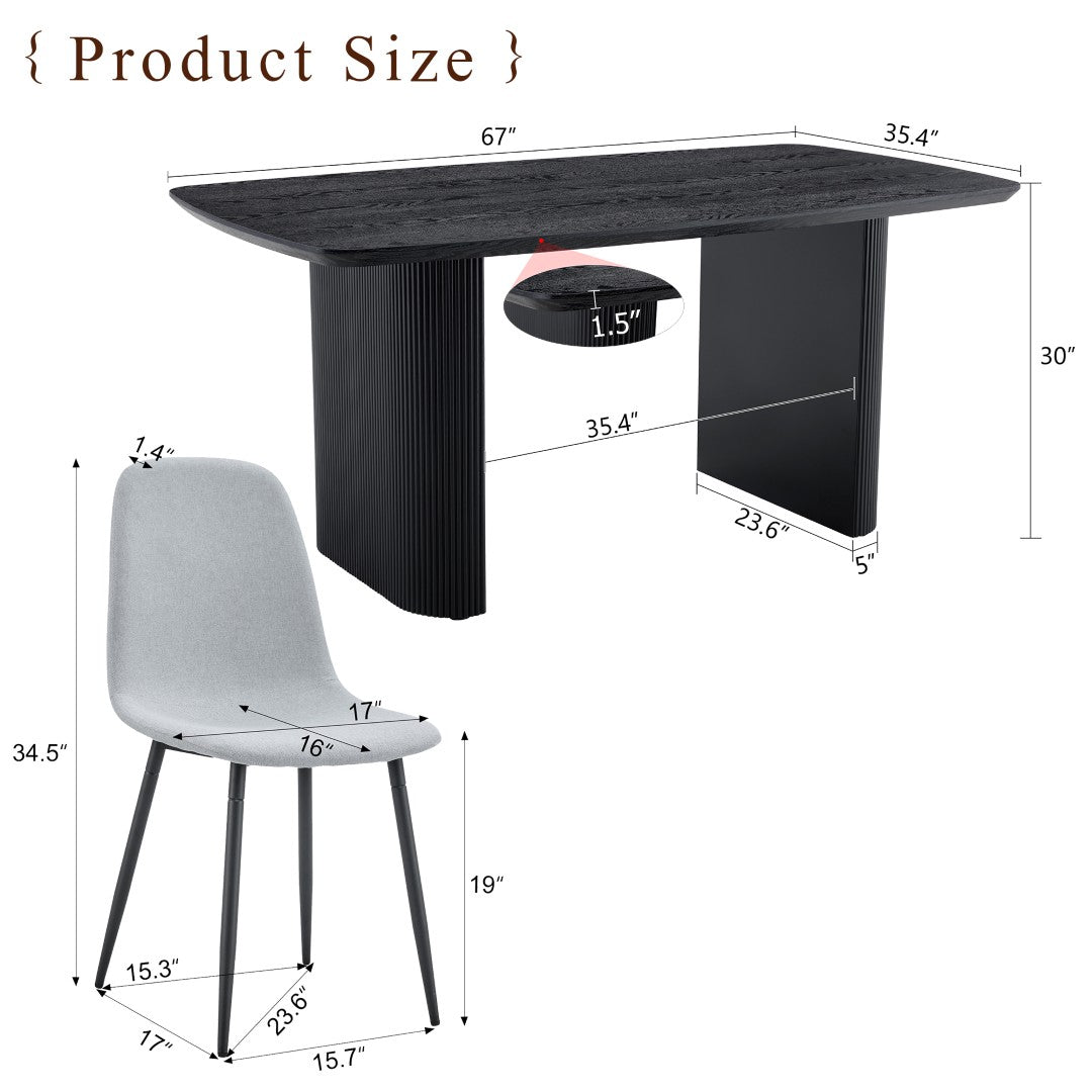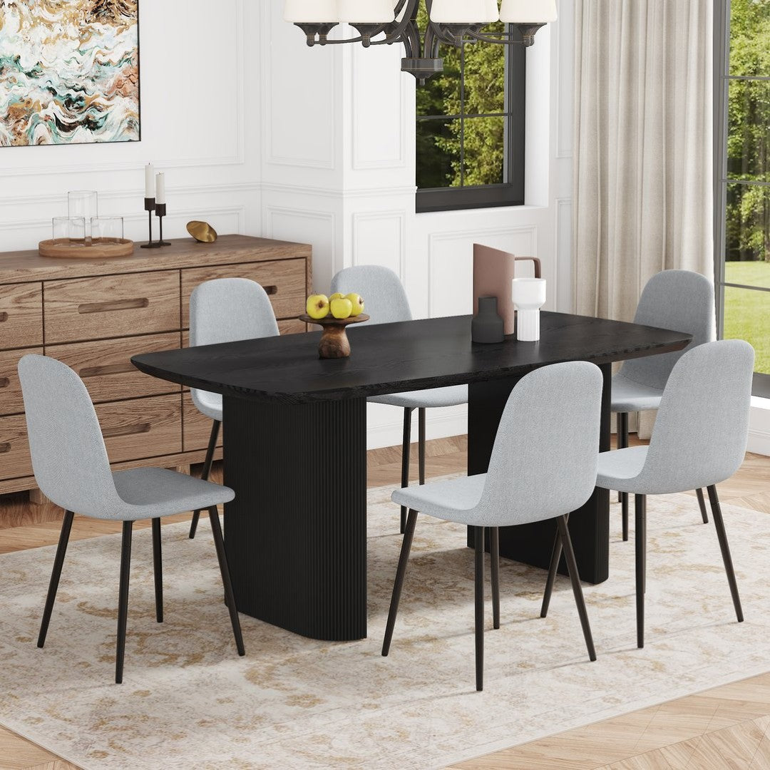 Elevate your dining space with a modern, cohesive set that blends minimalist luxury and everyday practicality. This coordinated table and 6-chair ensemble pairs a spacious, black wood-grain MDF table with six light-gray linen-cotton upholstered chairs on sturdy metal legs — designed for comfortable family meals, casual entertaining, and long-term durability.