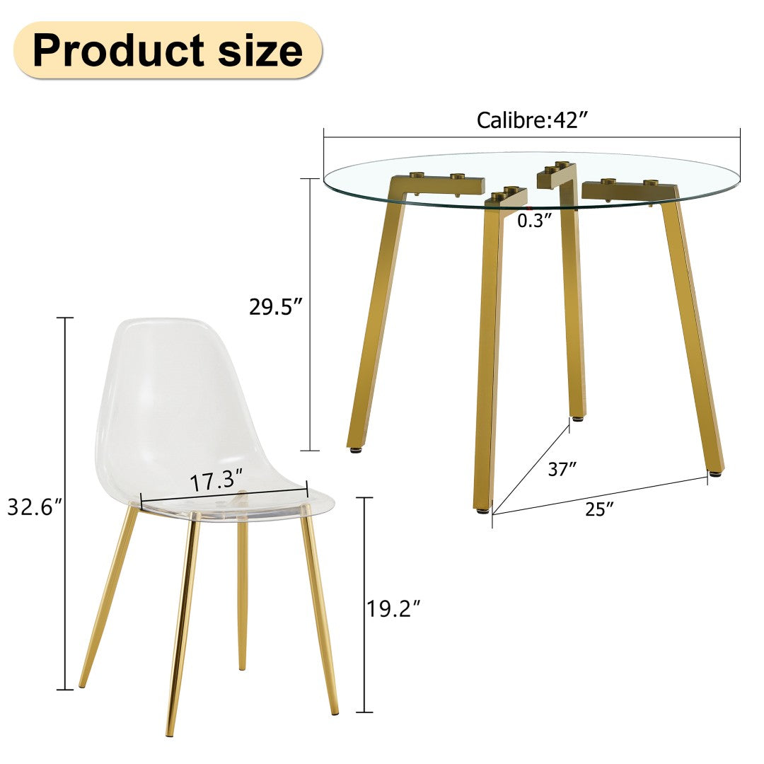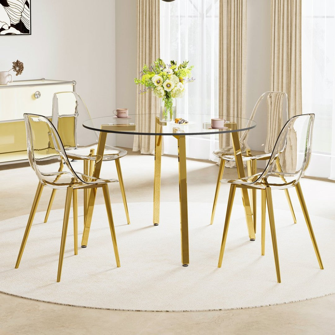 Bring modern elegance and airy transparency to your dining or café space with this cohesive 5-piece set: a round tempered glass table paired with four transparent plastic chairs, all accented by gold metal legs. The combination of clear materials and gold-finished frames creates a light, contemporary look that visually expands any room while delivering durable, easy-to-maintain functionality for everyday use.