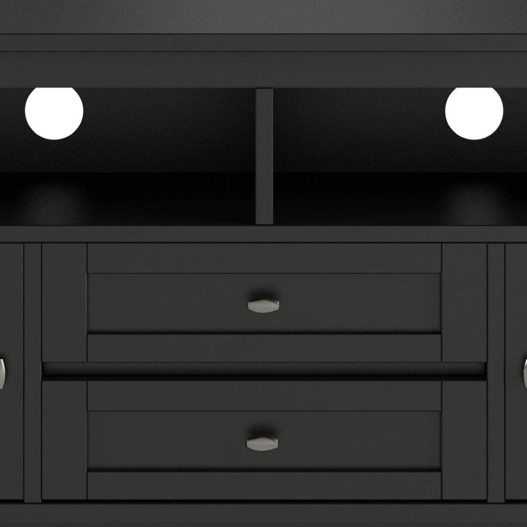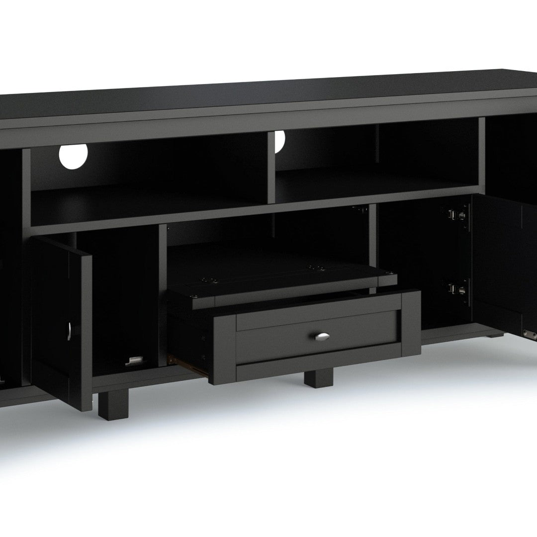Create a warm, functional focal point for your living room with this handcrafted media stand. Combining classic shaker styling with modern convenience, it offers generous storage, neat cord management, and a durable black finish that complements a range of decor styles. Ideal for larger TVs, the piece balances form and function for everyday use.