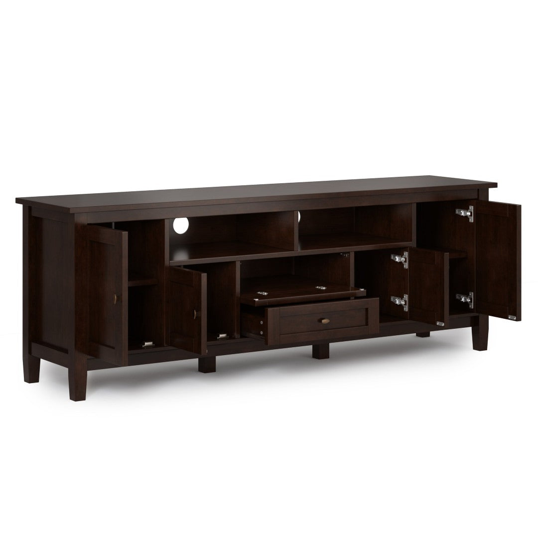 Bring warmth and timeless craftsmanship to your living room with this spacious, transitional TV media stand. Hand-finished in a russet brown tone that highlights the natural grain of solid wood, it combines classic shaker styling with modern functionality — ample concealed storage, dedicated media compartments, cord management, and sturdy construction make it ideal for anchoring your entertainment area.