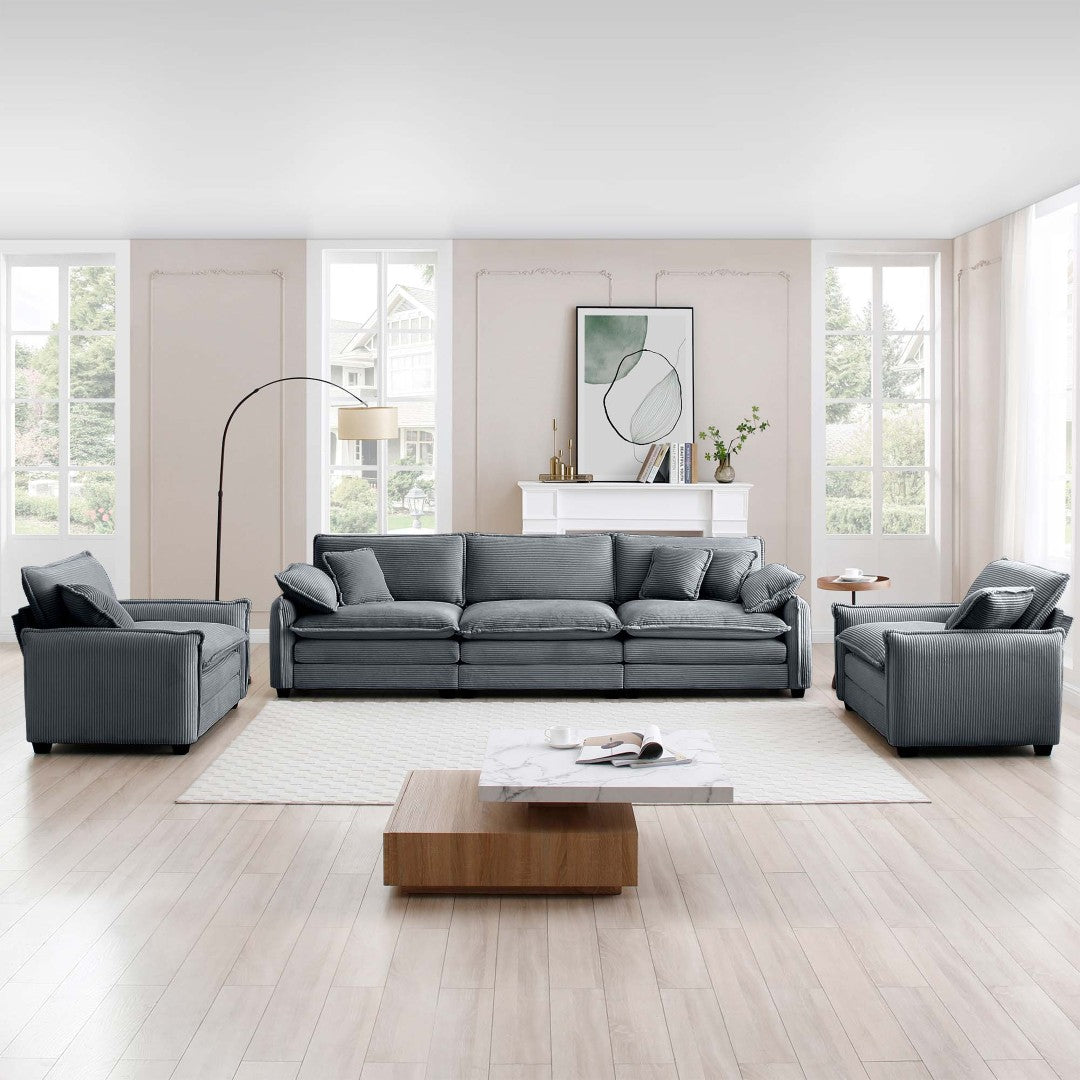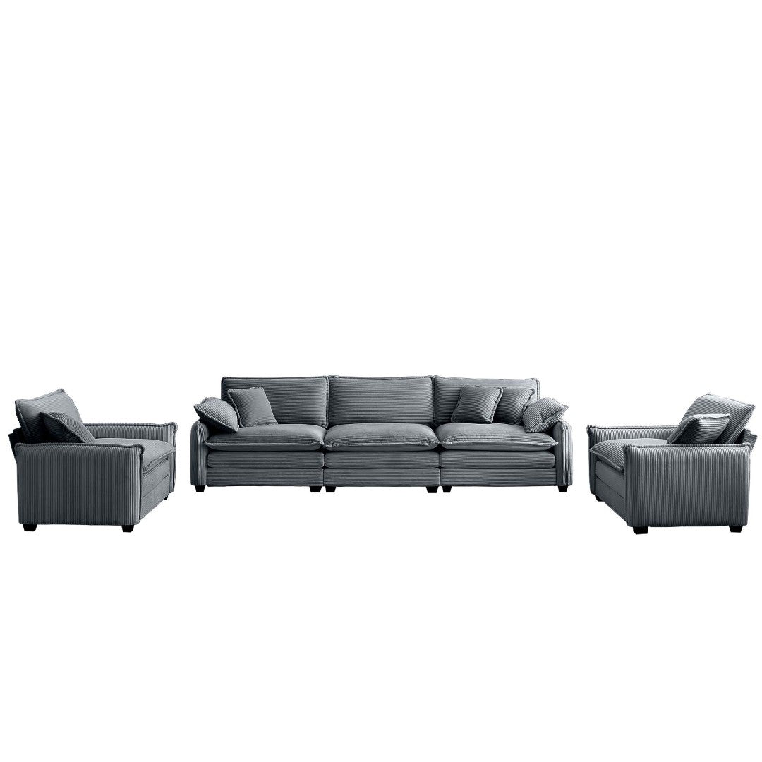 Sink into relaxed luxury with this home-theater style sofa set, designed to combine retro-inspired lines with modern comfort. Upholstered in plush grey corduroy, the set includes a three-seater sofa plus two single chairs and delivers cloud-like support thanks to double-layer memory foam cushions, removable armrests, and soft accent pillows—perfect for lounging, movie nights, or creating a cozy conversation area.