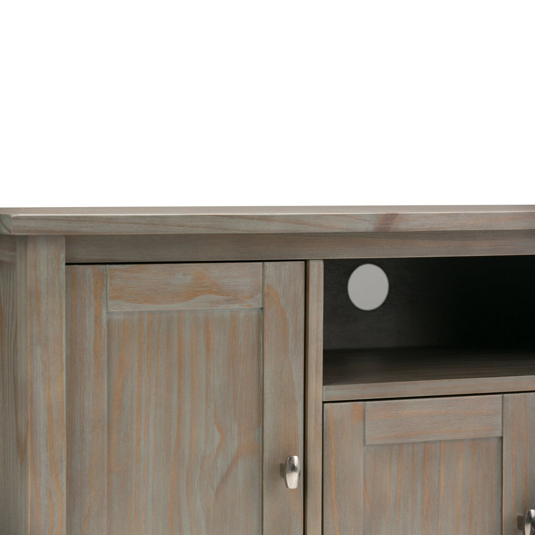 Bring warm, handcrafted charm to your living room with this roomy media stand featuring a distressed grey finish and classic shaker styling. Built from quality solid wood and finished by hand, it combines traditional details—like square tapered legs and antique nickel knobs—with practical storage and cable management to support modern home entertainment setups.