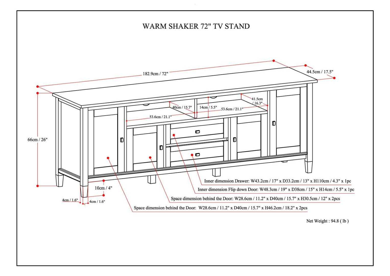 - Dimensions: 17.5" D x 72" W x 26" H (also listed as 75.98" L x 21.46" W x 9.06" H)