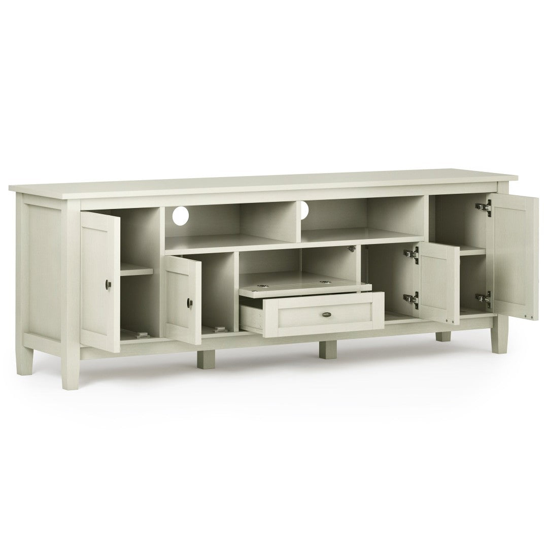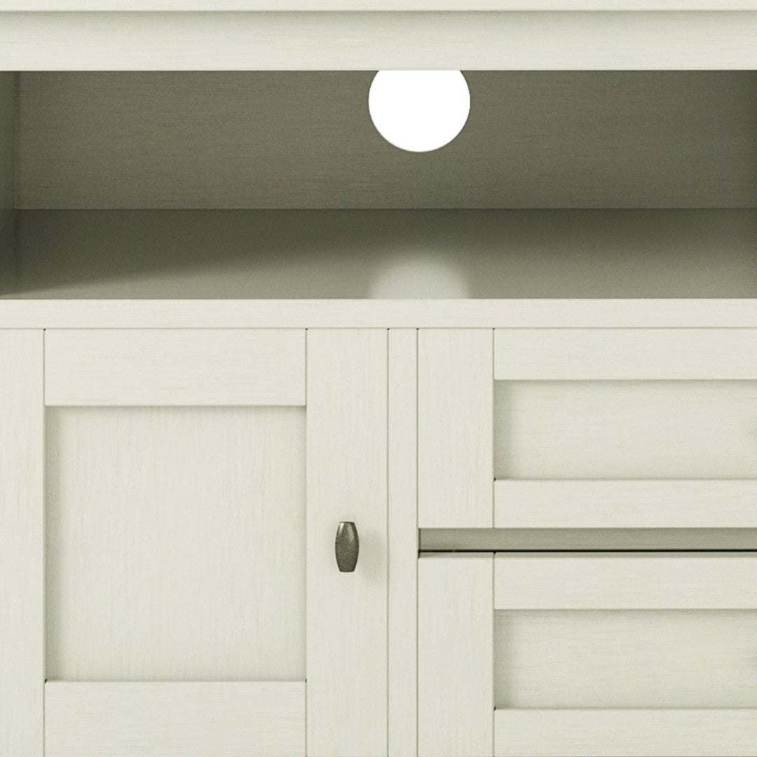 Bring timeless farmhouse charm and practical storage to your living room with this handcrafted media stand. Finished in Antique White to showcase natural wood grain, it blends rustic shaker styling with modern functionality to support large TVs and organize media components with ease.