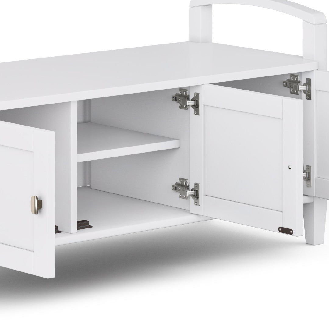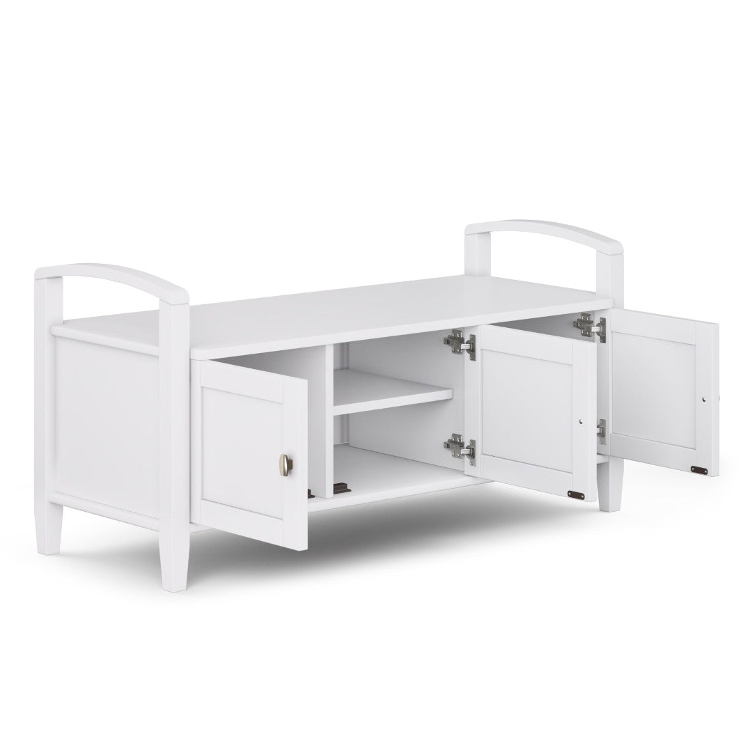 Bring order and style to your entryway with this handcrafted shaker-style storage bench. Finished in a clean white with subtle transitional details, it comfortably seats two while concealing ample storage behind three shaker doors—perfect for shoes, scarves, and everyday essentials. Durable solid wood construction, brushed nickel hardware, and a protective lacquered finish combine for lasting beauty and easy maintenance.
