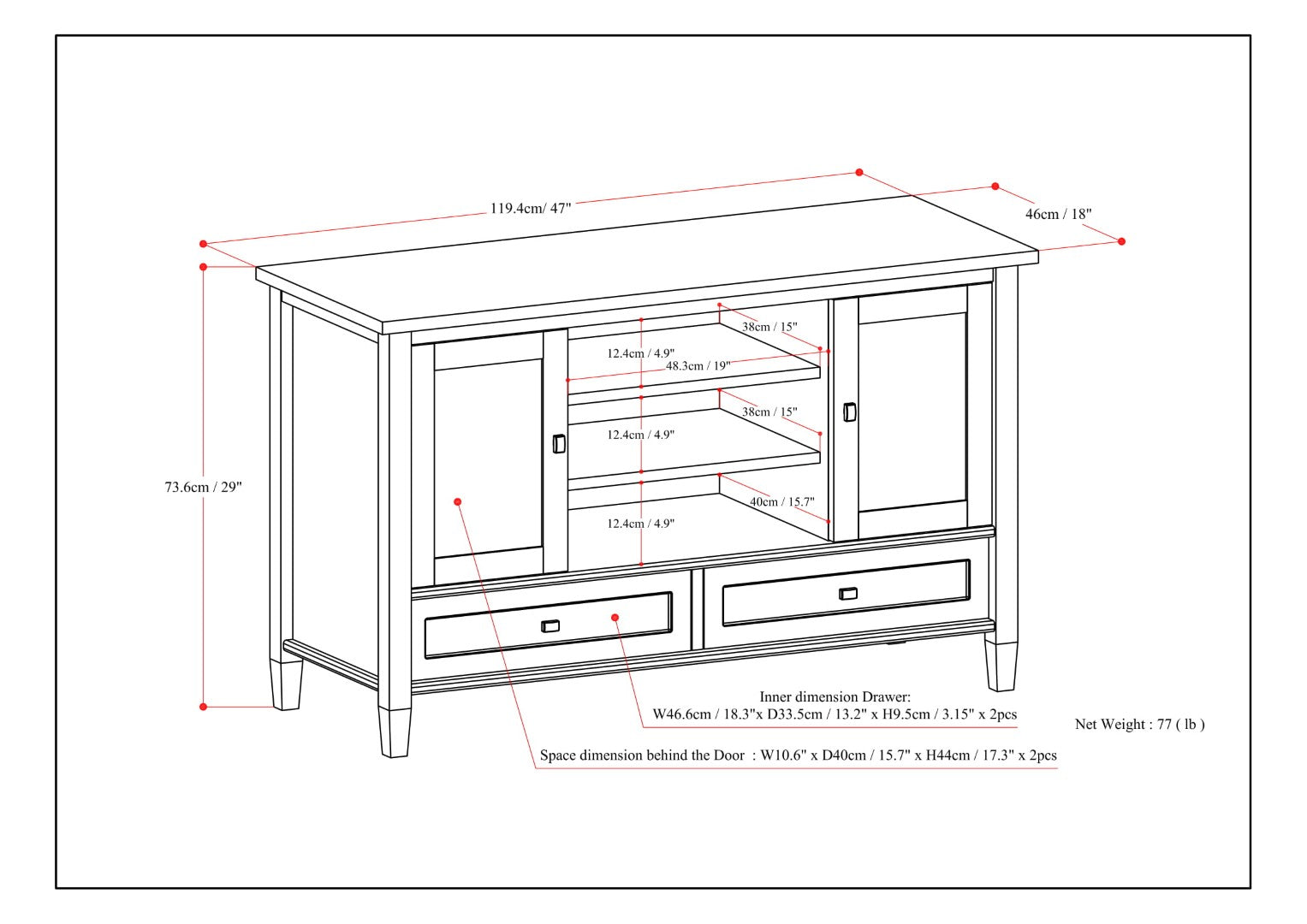 - Storage configuration: Two bottom drawers with shaker-style fronts and metal drawer glides; two side doors with interior storage and one adjustable shelf for flexible organization