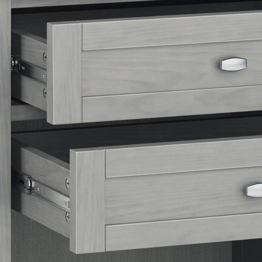 - Generous Drawer Space: Two drawers with smooth metal glides and nickel pulls provide organized storage.