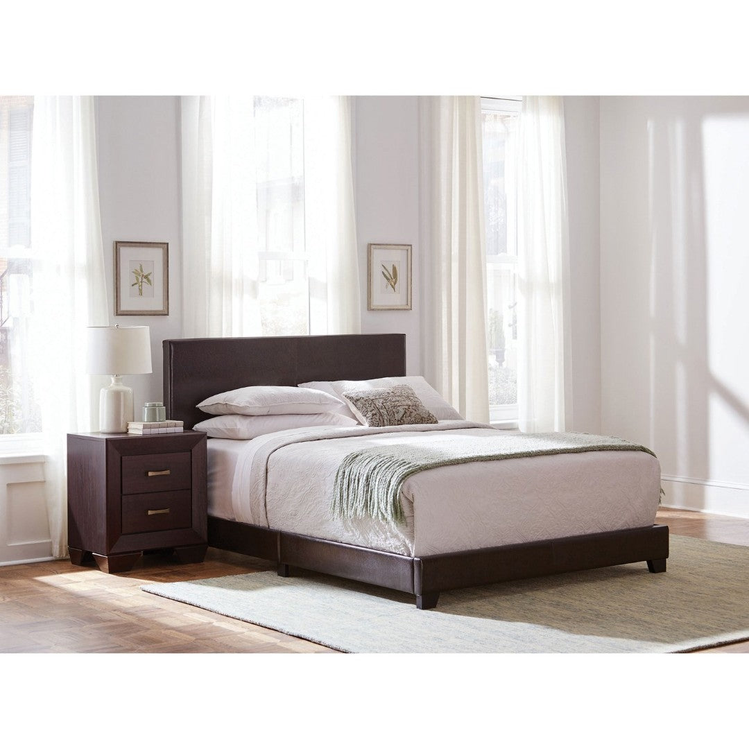 Create a warm, inviting focal point for your bedroom with this upholstered Eastern King panel bed. Its rich brown upholstery and softly padded headboard combine comfort and refined style, while solid wood legs ensure reliable support. The design works well with traditional, transitional, or modern decor and requires a box spring for optimal mattress support and longevity.