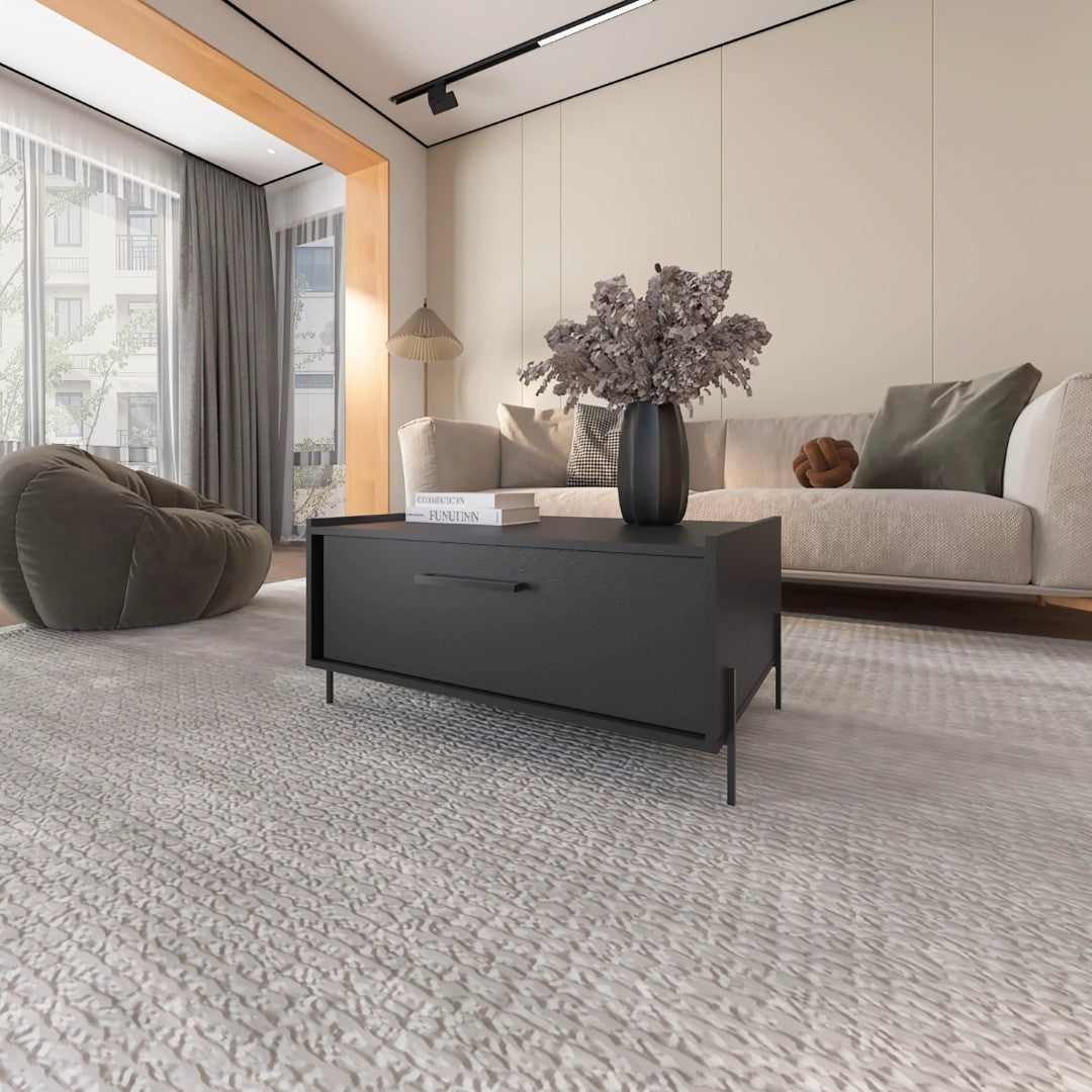 - The coffee table features a practical flip-down door, offering discreet storage space to keep items like remotes, magazines, or books neatly tucked away while maintaining a clean and organized look