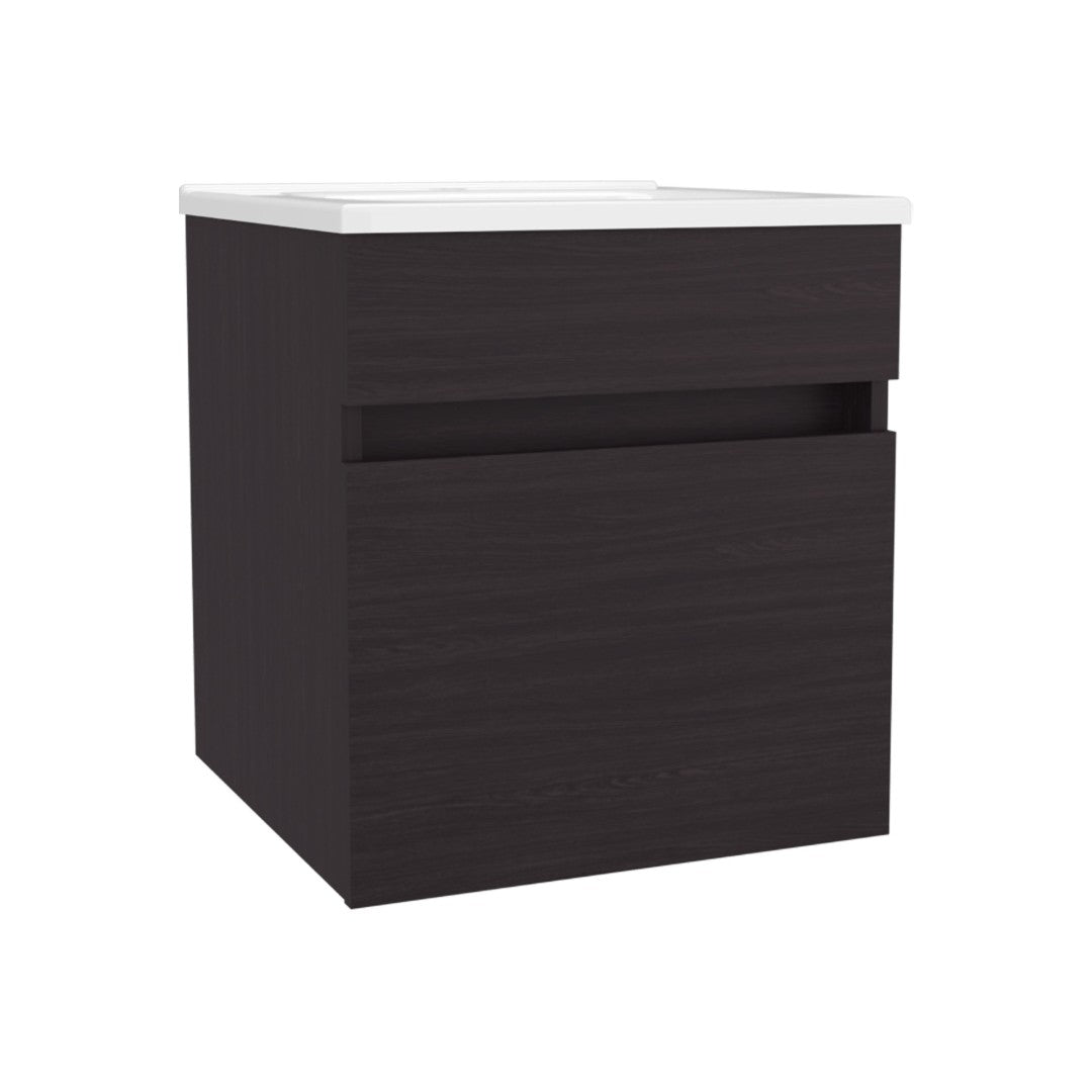- Showcases a rich Wengue finish with a wall-mounted design, combining sleek aesthetics and space-saving functionality for modern bathrooms
