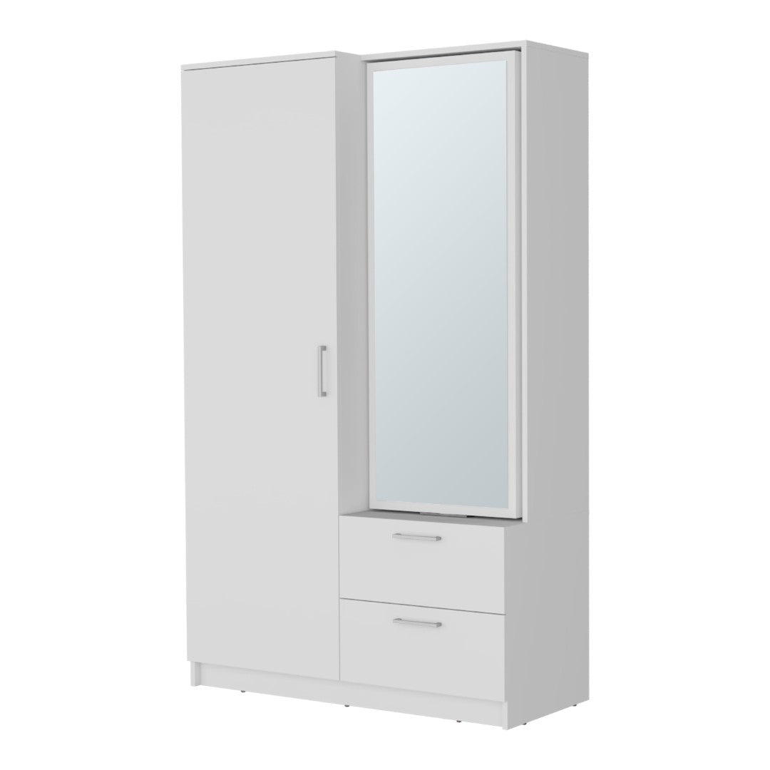 Brighten and organize your bedroom with this elegant White Armoire Wardrobe — a versatile storage solution that combines open shelving, concealed drawers, and a built-in mirror to keep everyday items accessible and neatly arranged. Its clean white finish reflects light to make rooms feel larger, while durable melamine-over-particleboard construction provides long-lasting performance and easy care. Ideal for bedrooms, guest rooms, or entryways, this armoire balances style and function for modern living.