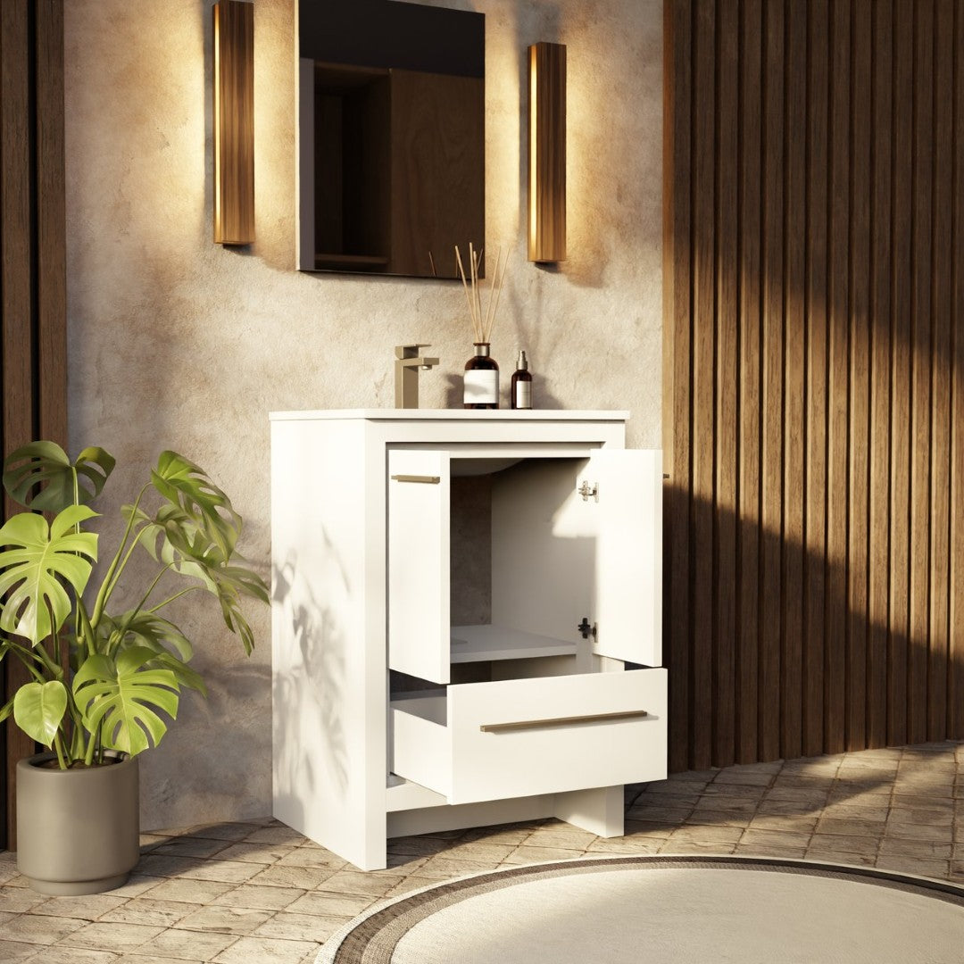 - Vanity Footprint: 24 in. W x 20 in. D — designed for smaller bathrooms, powder rooms, or tight spaces