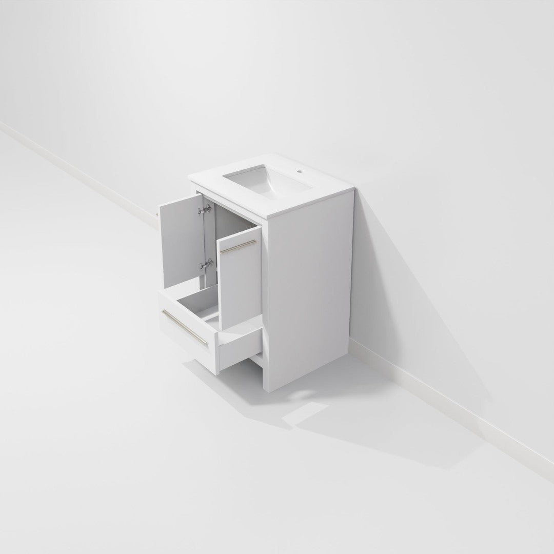 Refresh your bathroom with this compact white bath vanity that pairs classic styling with durable materials and practical storage. Its cultured marble top offers a scratch- and stain-resistant surface that’s pre-drilled for a single-hole faucet, while the solid wood frame and soft-close hardware ensure lasting quality and quiet operation.