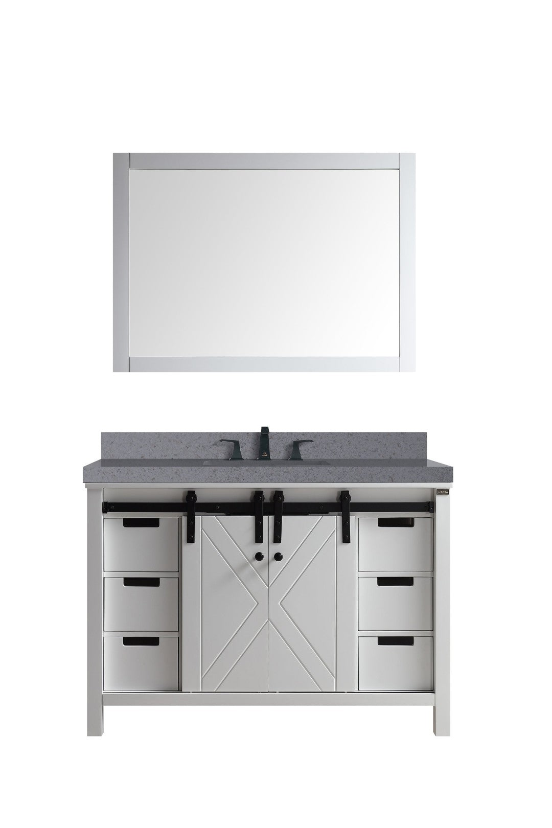 Elevate your bathroom with this elegant white vanity ensemble that blends classic styling with modern durability. Ideal for busy family bathrooms or guest powder rooms, the set includes a spacious vanity cabinet, a grey quartz countertop with a resilient finish, a coordinating faucet, and a large mirror — everything needed for a cohesive, move-in-ready look.